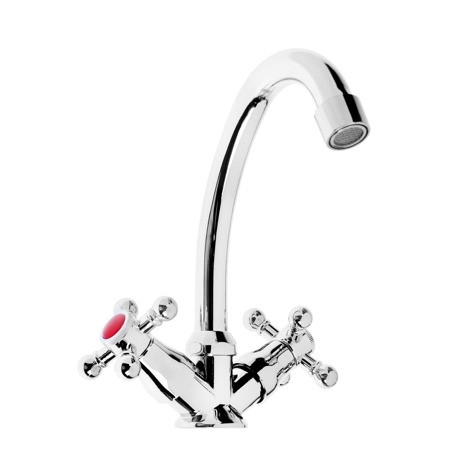 Смеситель на шпильке с керамической кран-буксой устанавливается на мойку. Изделие имеет длинный поворотный излив и 2 хромированных вентиля для регулирования температуры и напора воды.