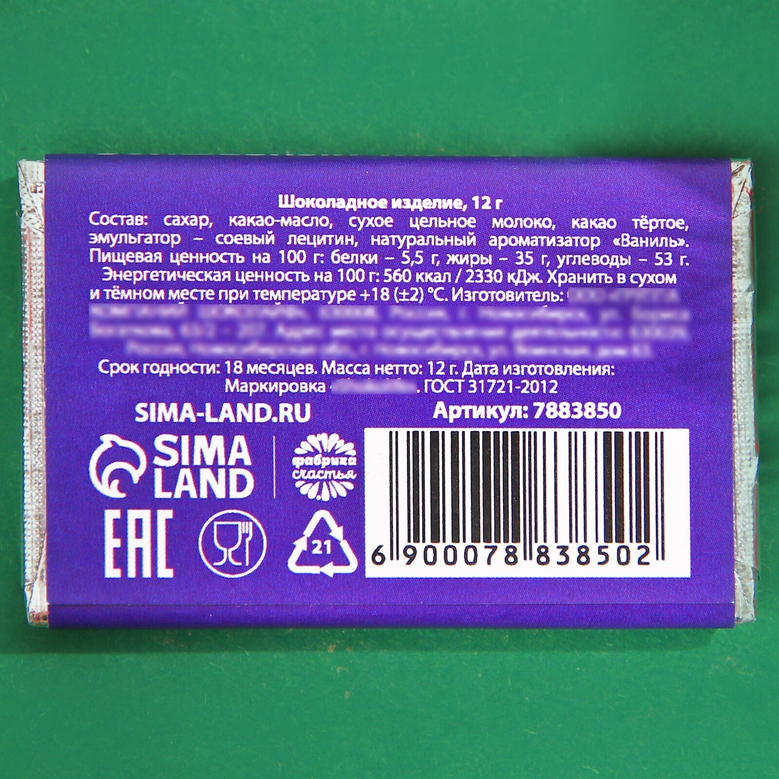 Состав: сахар, какао-масло, сухое цельное молоко, какао тёртое, эмульгатор – соевый лецитин, натуральный ароматизатор «Ваниль».
