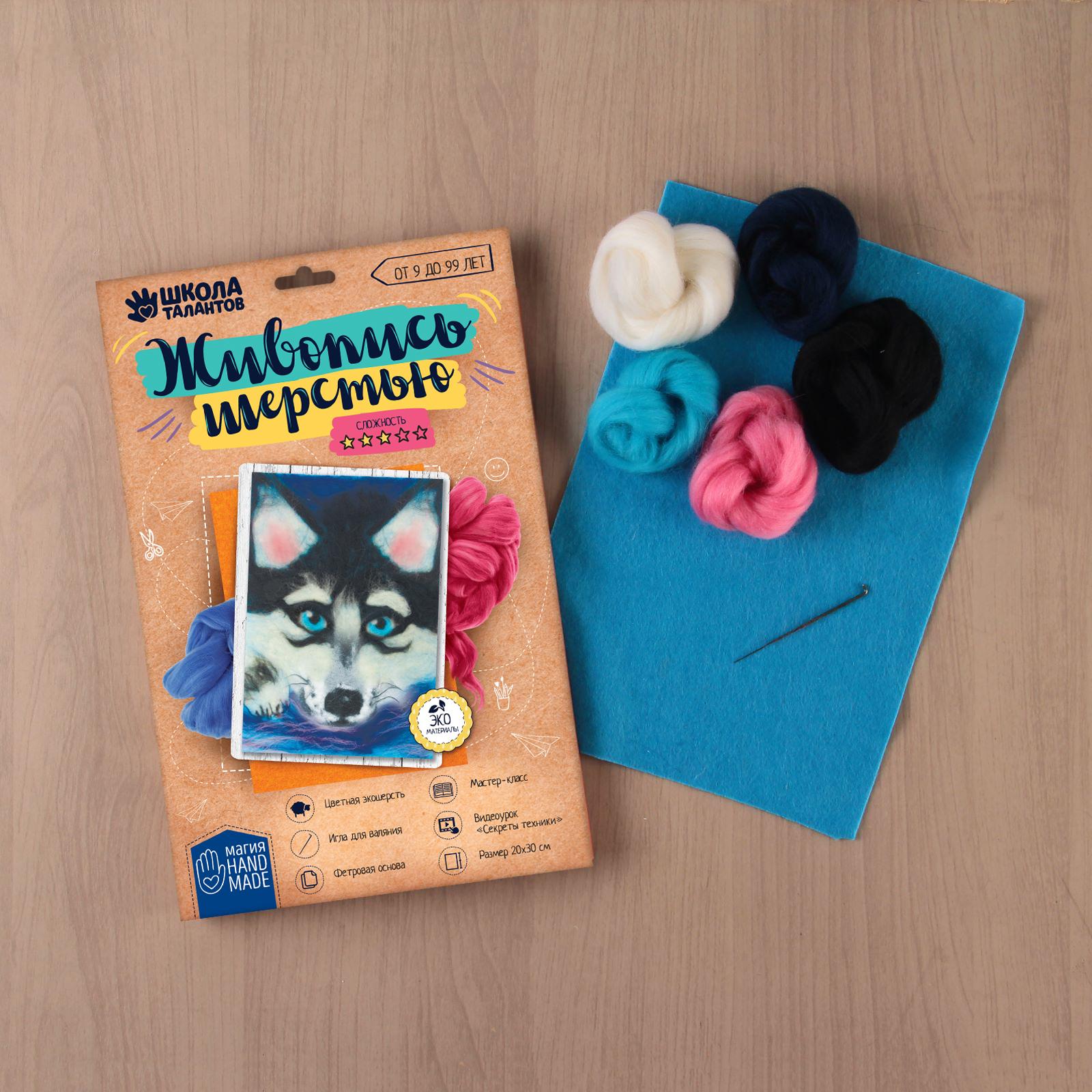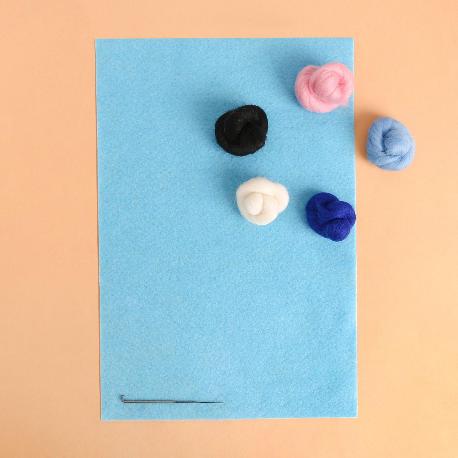 В комплекте вы найдёте лоскуты цветной шерсти, специальную иглу и лист фетра, который будет служить холстом для вашей картины. Дополнительно вам понадобятся ножницы, губка или кусок поролона и немного воды для смачивания пальцев во время работы.