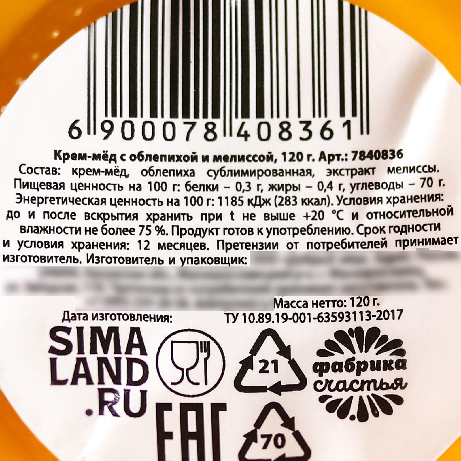 Состав: крем-мёд, облепиха сублимированная, экстракт мелиссы.