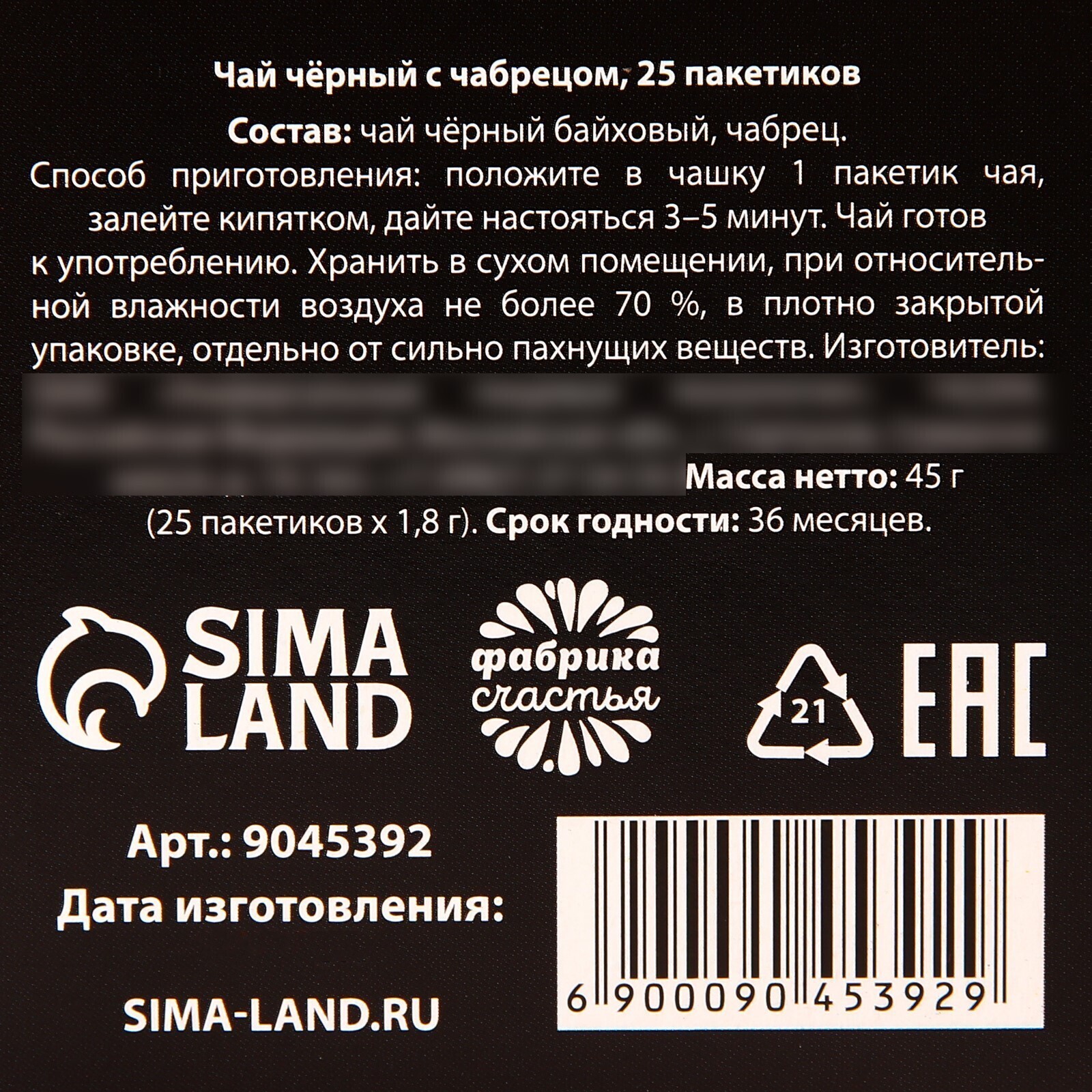Состав: Чай чёрный байховый, чабрец. Масса нетто: 45 г (25 пакетиков x 1,8 г) Срок годности: 36 месяцев.