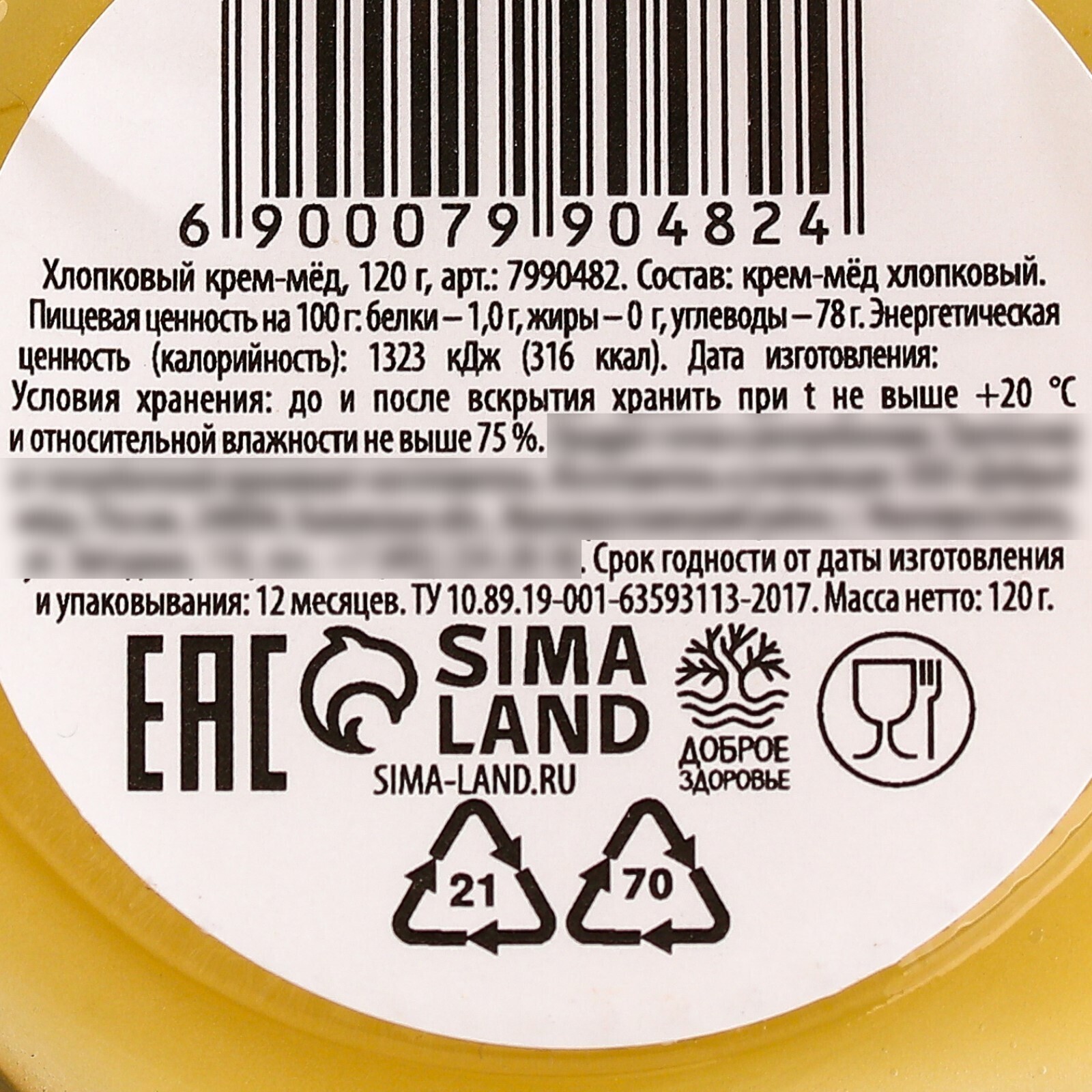 Состав: крем-мёд хлопковый. Масса нетто: 120 г. Срок годности от даты изготовления и упаковывания: 12 месяцев