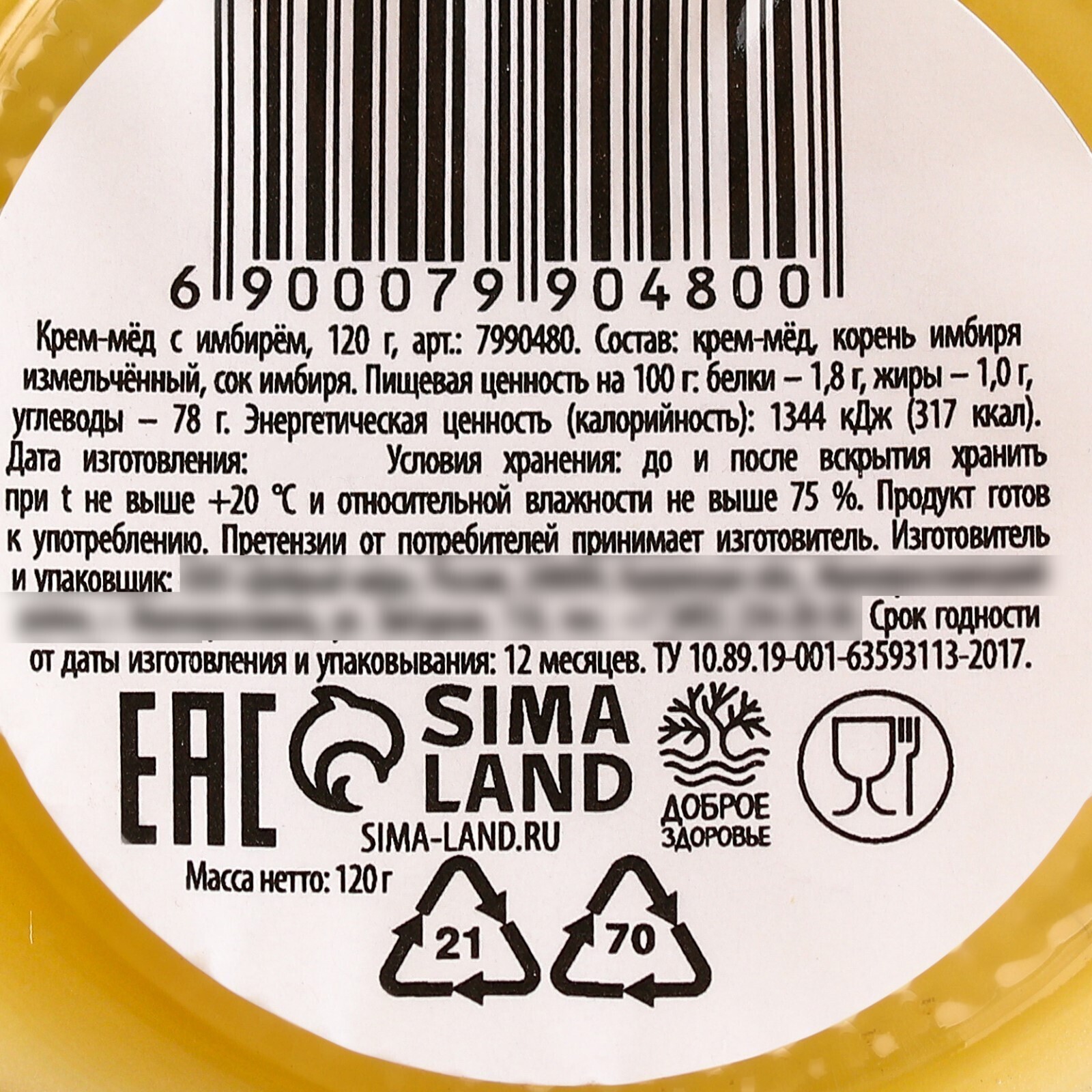 Состав: крем-мёд, корень имбиря измельчённый, сок имбиря. Масса нетто: 120 г. Срок годности от даты изготовления и упаковывания: 12 месяцев