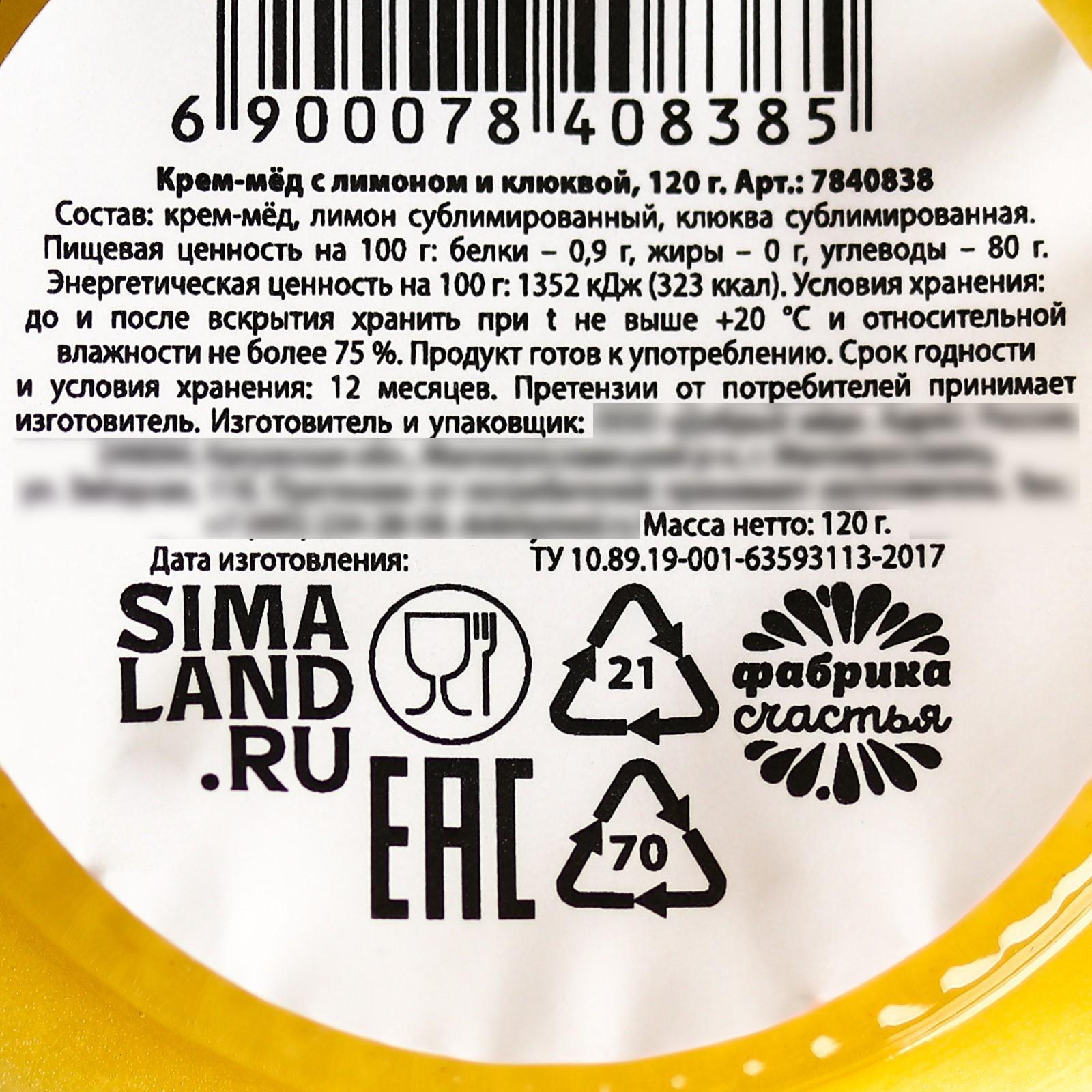 Состав: крем-мёд, лимон сублимированный, клюква сублимированная. Масса нетто: 120 г Срок годности и условия хранения: 12 месяцев.