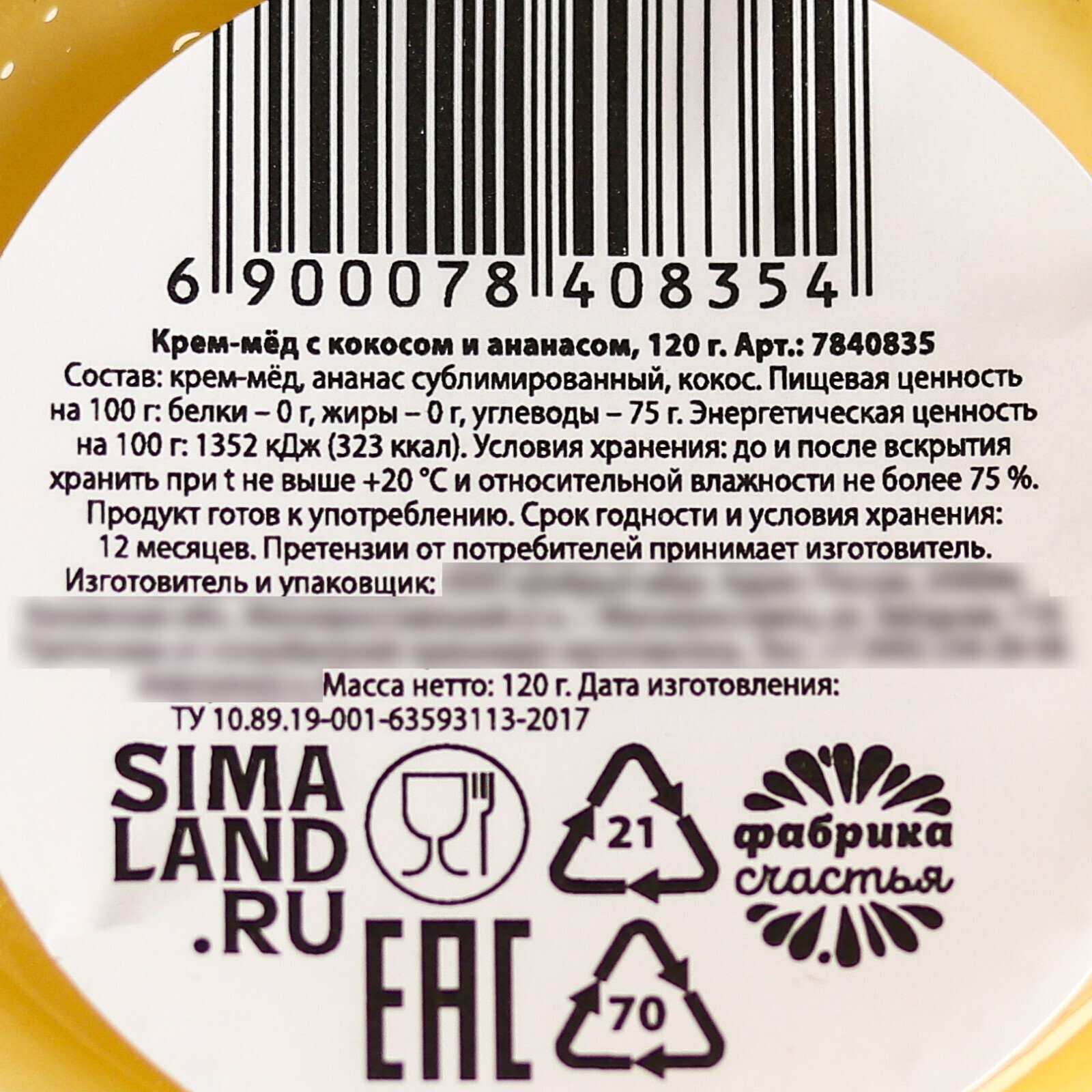 Состав: крем-мёд, ананас сублимированный, кокос. Масса нетто: 120 г Срок годности и условия хранения: 12 месяцев.