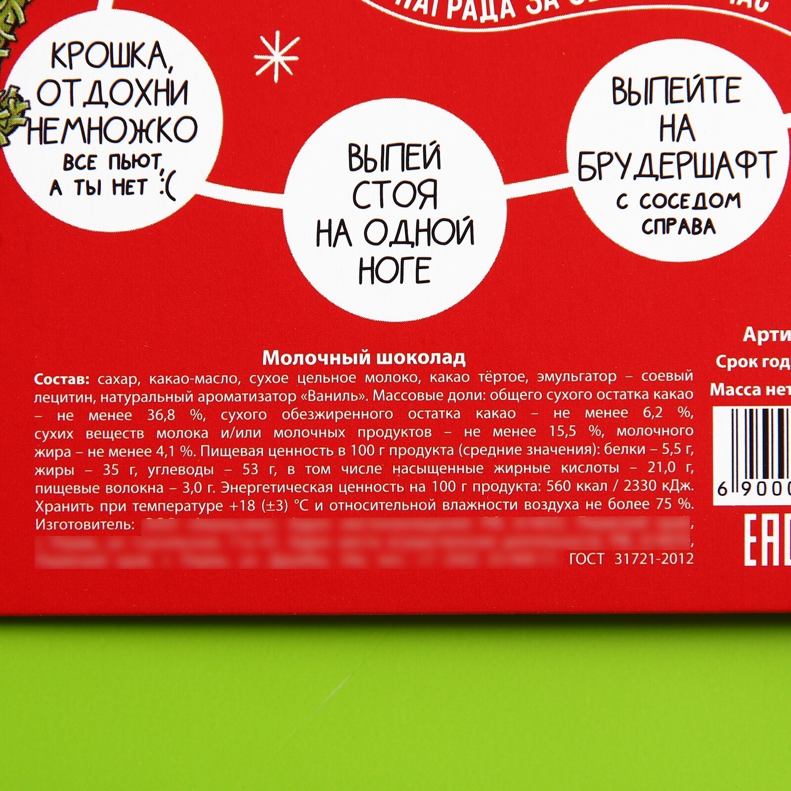 Состав: сахар, какао-масло, сухое цельное молоко, какао тёртое, эмульгатор – соевый лецитин, натуральный ароматизатор «Ваниль».