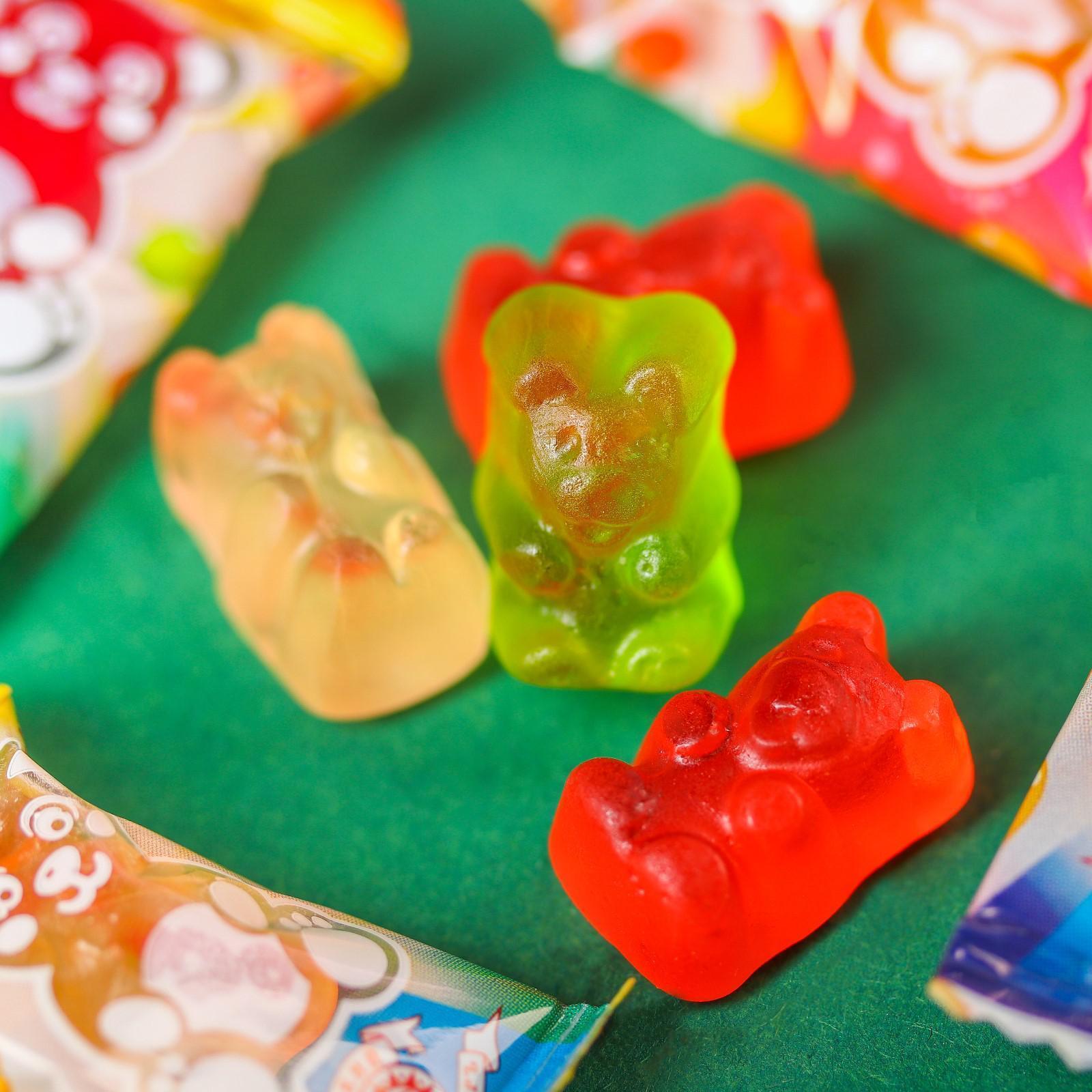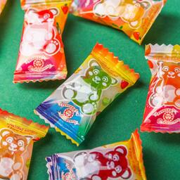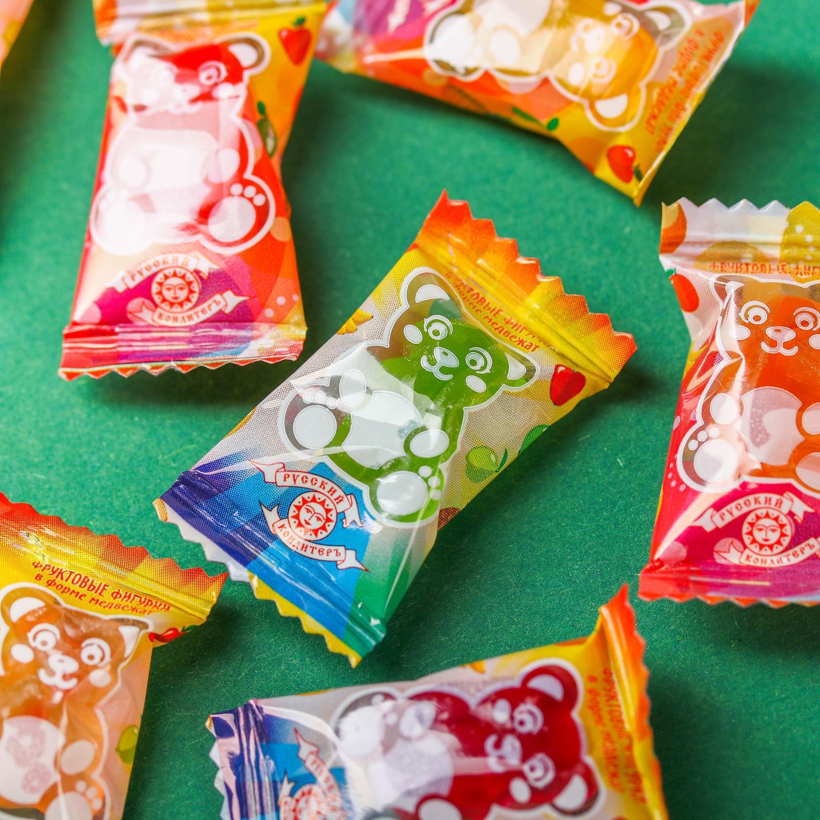 Состав: сахар-песок, патока карамельная, желирующий агент – желатин, натуральный сок яблочный, регулятор кислотности – лимонная кислота, влагоудерживающий агент – сорбитовый сироп, ароматизаторы: апельсин, абрикос, груша, клюква, малина, дыня, глазирователь: растительное масло, карнаубский воск, консервант, сорбиновая кислота, красители искусственные: «Понсо 4R», «Хинолиновый желатин», «Зеленый горошек», «Красный мак», желтый «Солнечный закат», FCF.