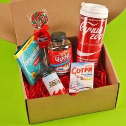 Гифтбокс «С новым годом, но не от всего сердца»: чай чёрный с лимоном 50 г., драже 80 г., молочный шоколад 20 г., термостакан 350 мл., леденец с вишней, 15 г. 7772583