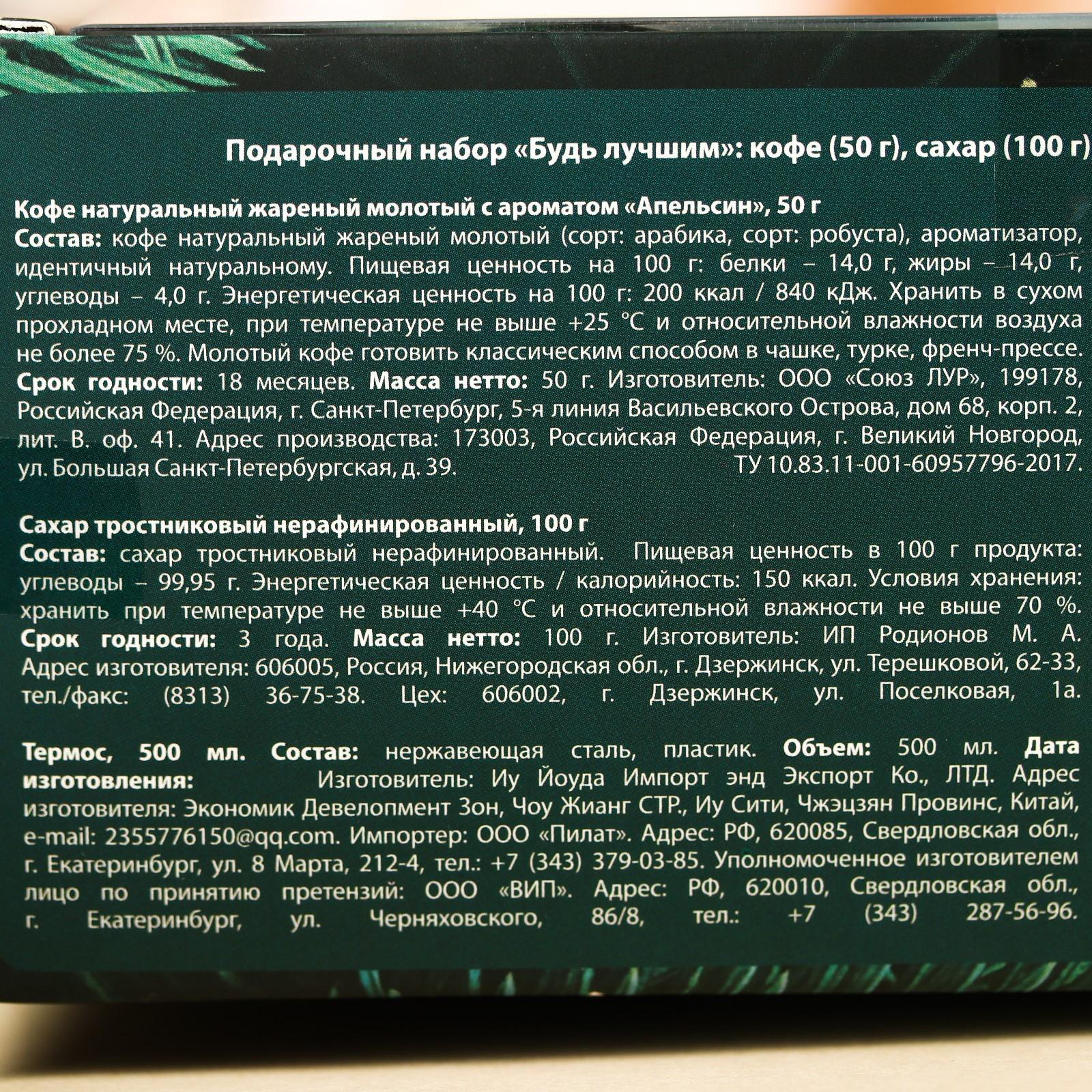 Подарочный набор «Будь лучшим»: кофе с ароматом "Апельсин" 50 г., сахар тростниковый 100 г., термос 500 мл. 6916071