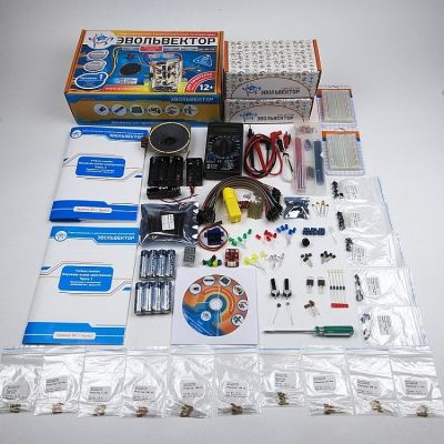 Базовый набор представлен готовыми материалами для изучения электроники. Курс включает практику и теорию, рассчитан на 30 уроков.