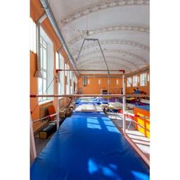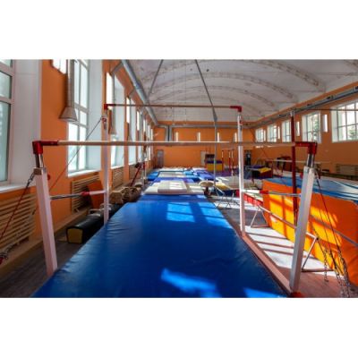 Профессиональное покрытие для пола используется в школе во время занятий на разновысоких брусьях.