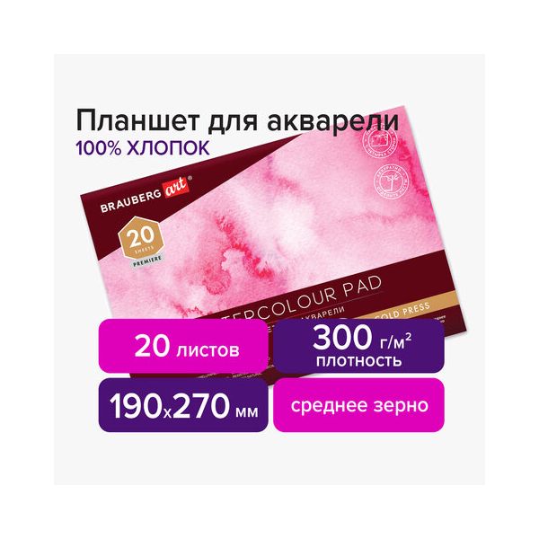 Описание товара 113240, Планшет для акварели ХЛОПОК 100%, 300 г, 190х270 мм, склейка, 4 стороны, среднее зерно, 20 л., BRAUBERG ART, 113240