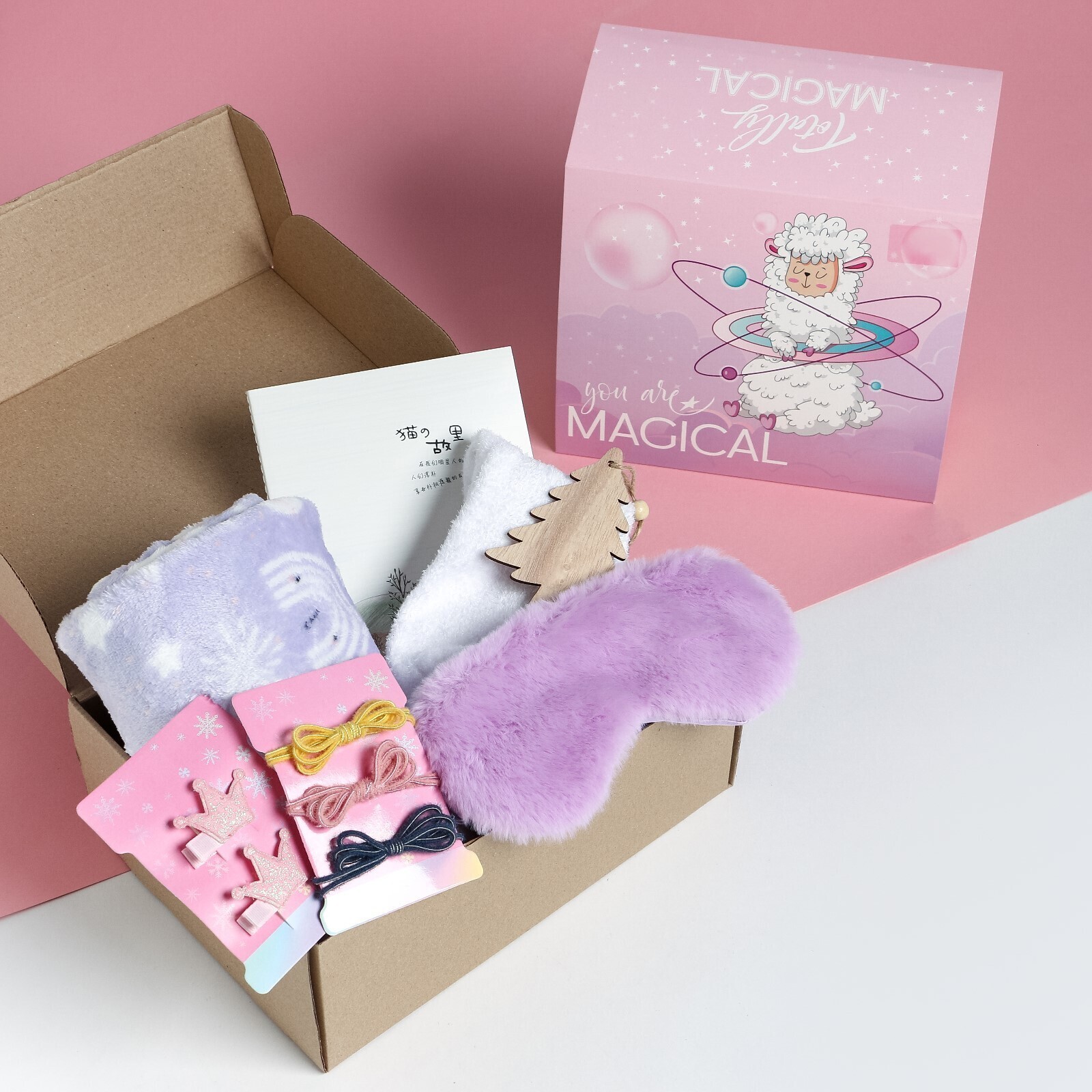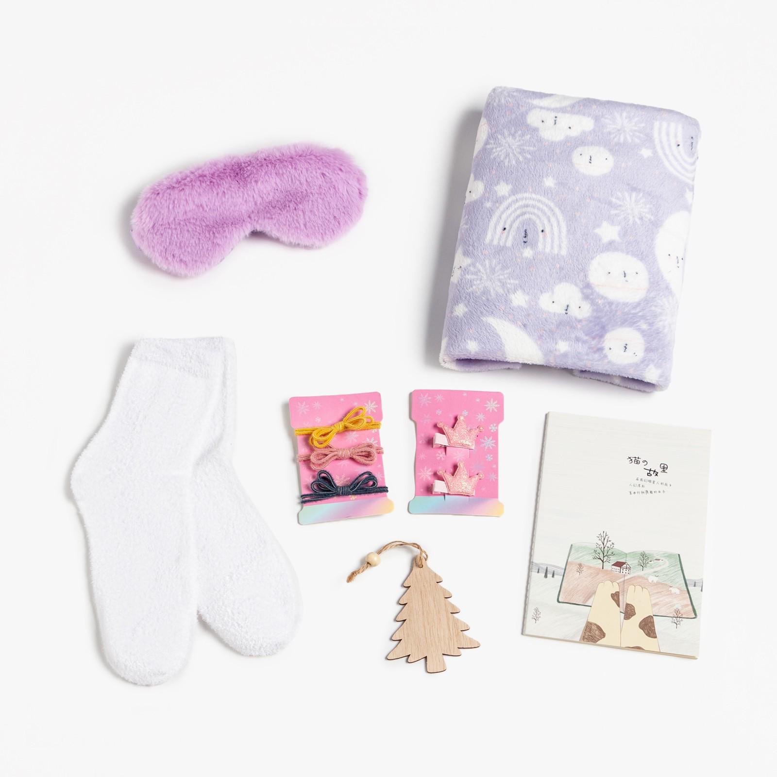 • Составляющие набора Блокнот, Заколка, Игрушка, Маска для сна, Носки, Плед, Резинка
