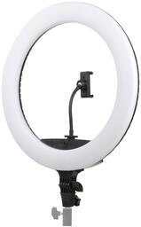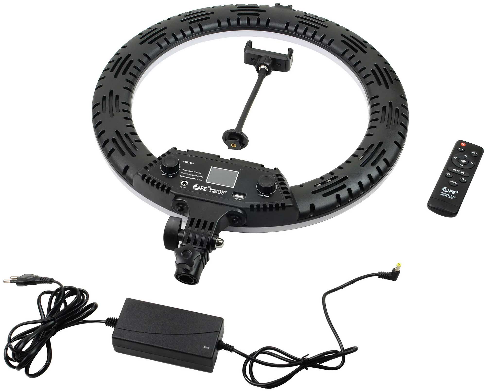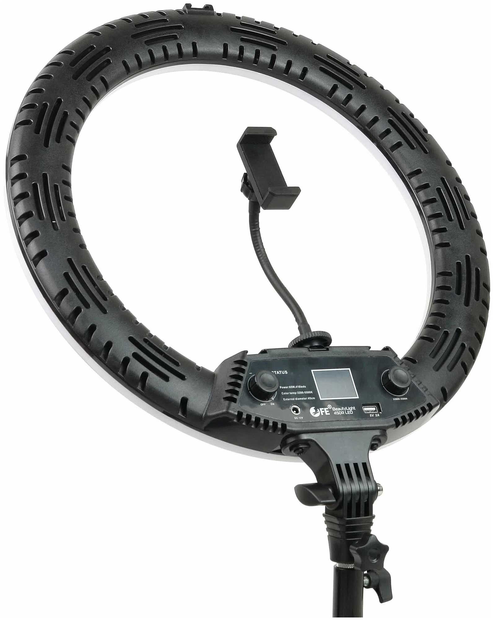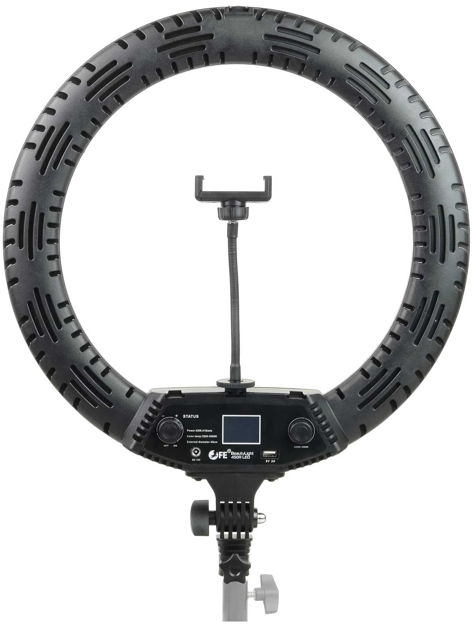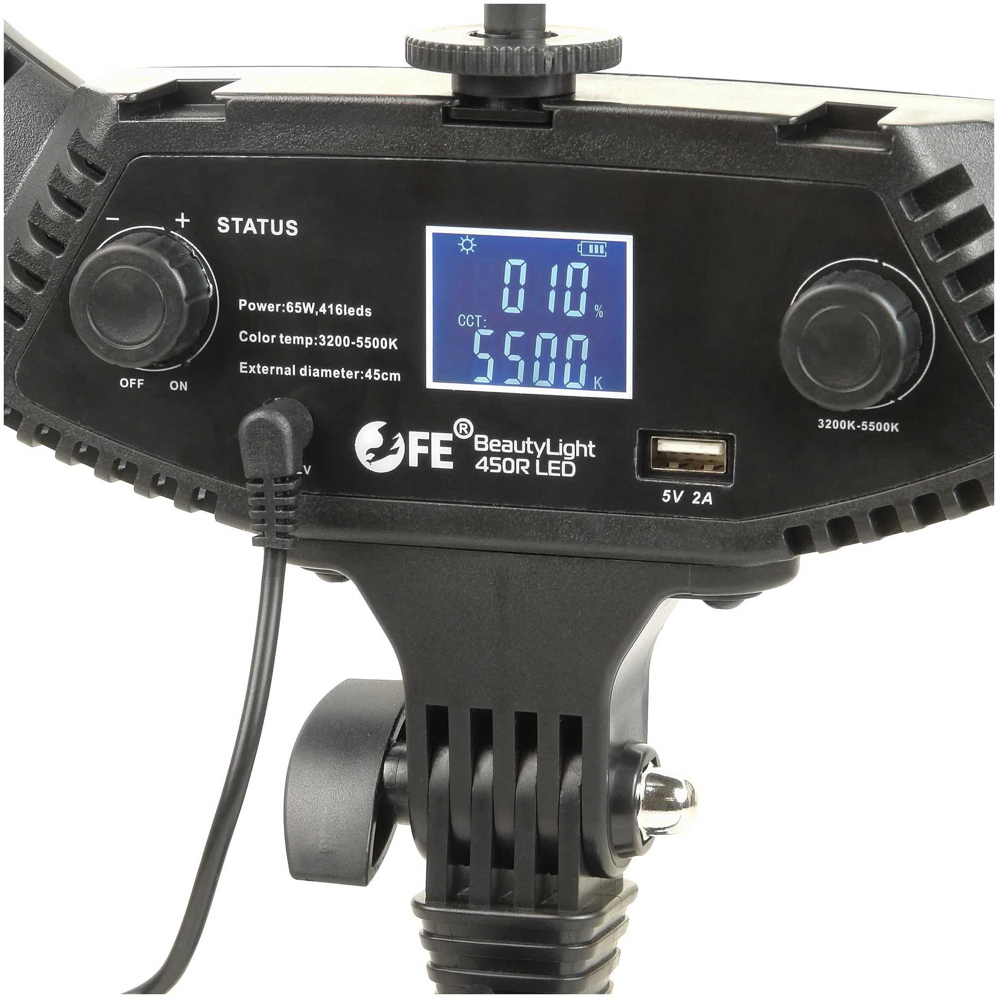 Falcon Eyes BeautyLight 450R LED – компактный биколорный кольцевой осветитель ?45 см, на световой панели которого расположено 416 светодиодов «теплого» и «холодного» света, с плавно регулируемой цветовой температурой и мощностью светового потока от 10 до 100% (65 Вт). В осветительном приборе предусмотрены 5 динамических световых спецэффектов, которые разнообразят видеоряд и сделают съемку креативнее. Держатель смартфона, пульт дистанционного управления и сумка для переноски осветителя входят в комплект. Кольцевые осветители серии BeautyLight используются в качестве источника постоянного света различных сферах фотои видеопроизводства. Такие осветители пользуются большой популярностью у блогеров, косметологов, визажистов, фотографов и видеографов, в задачи которых входит съемка людей крупным планом. Кроме того устройства часто задействованы в предметной съемке, записи мастер-классов, обзоров и многого другого. Мягкое бестеневое освещение выравнивает тон лица, сглаживает неровности и представляет объект съемки наилучшим образом. Кольцевая форма создает интересные блики в глазах или на блестящих поверхностях.
