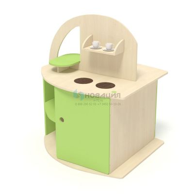 2-хсторонняя игровая мебель знакомит с обстановкой кухни. Подходит для групповых занятий. Детский уголок помогает запомнить названия предметов и действий, освоиться в быту, развить коммуникативные способности.