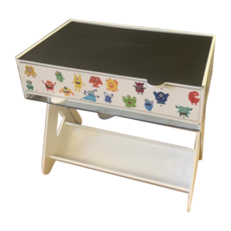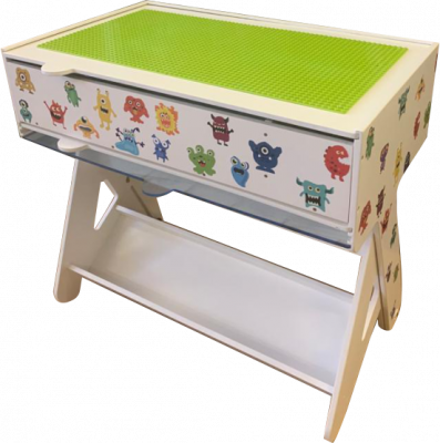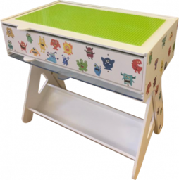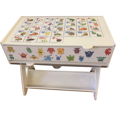 Столик с наклонными опорами подходит для развивающих занятий, водной и песочной анимации. Конструкция сопровождается материалами, инструментами, освещением. Панели с разными функциями заменяют поверхность столешницы (2 из них 2-хсторонние). На досках ребенок рисует и обводит контуры, на игровом поле тренирует логику, по табличке с буквами и картинками изучает азбуку. Между опорами предусмотрена прямоугольная полка с бортиками.