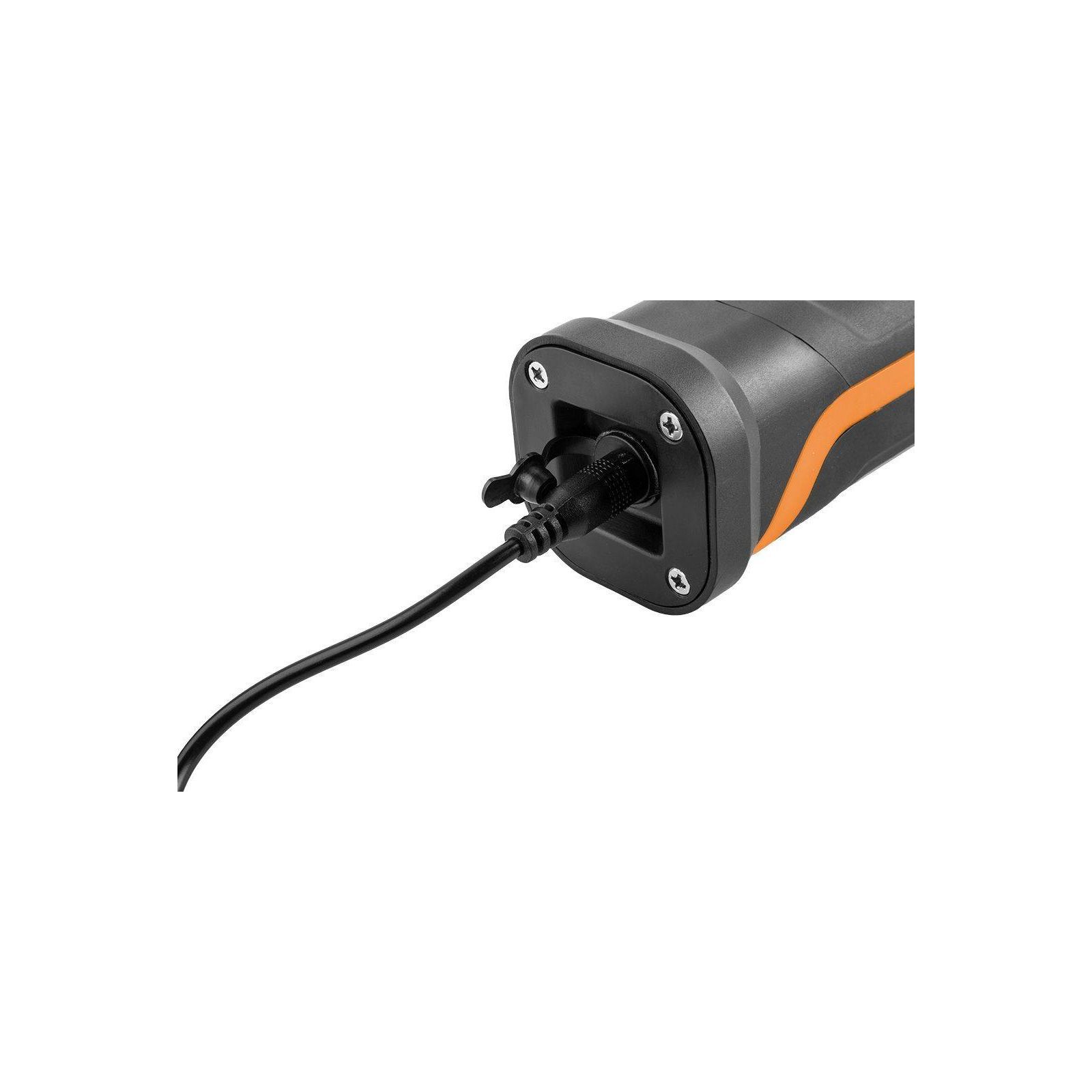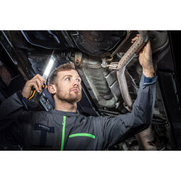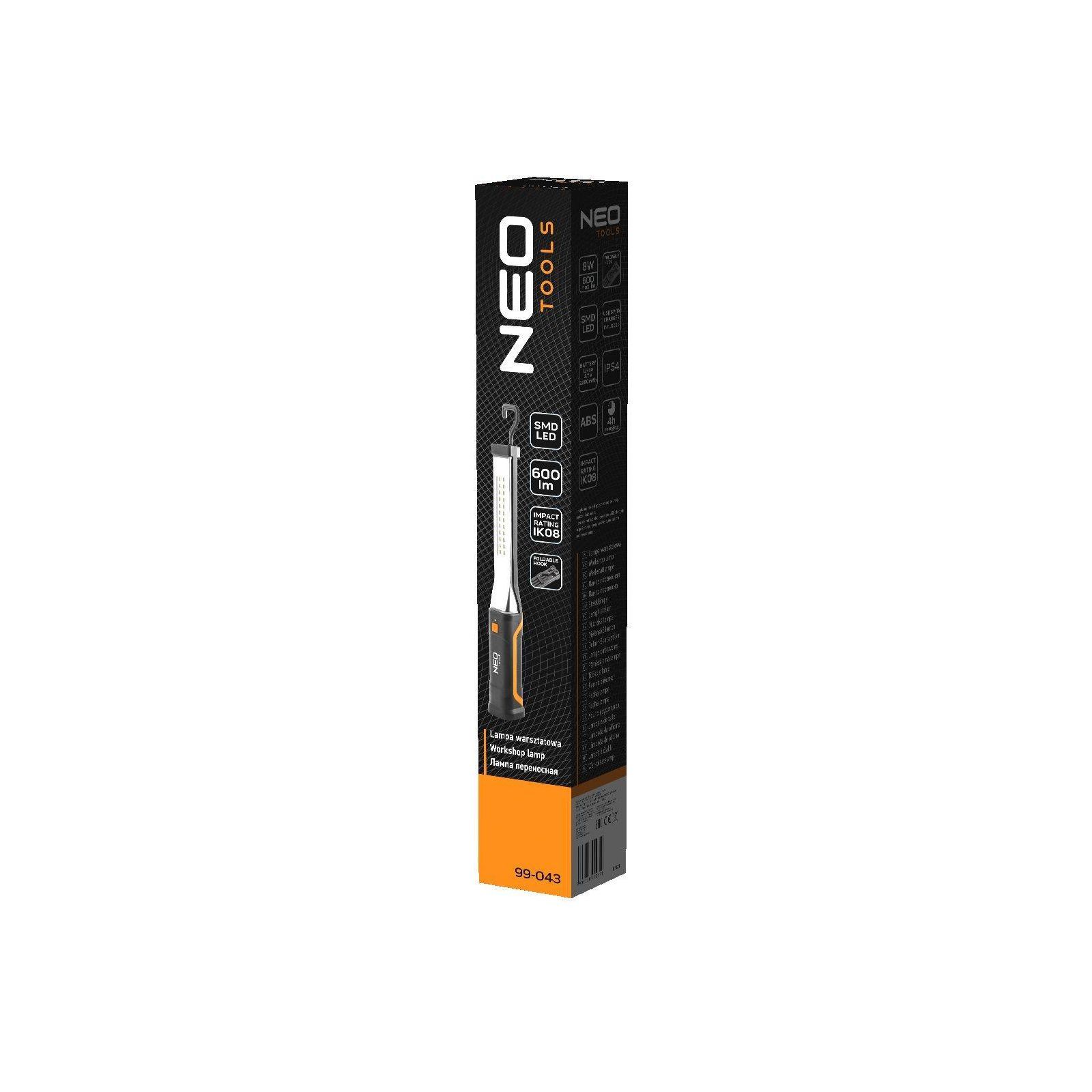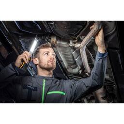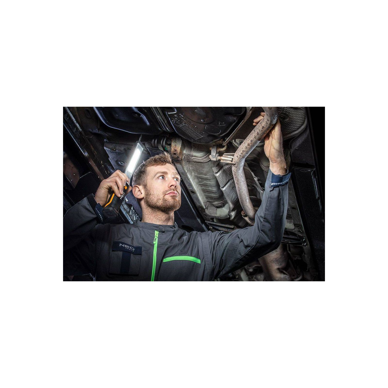 Акумуляторна лампа для майстерні зі світловим потоком 600 люмен та потужністю 10Вт оснащена світлодіодами високого класу SMD LED. Виріб має дві функції освітлення: 100%/30%. Лампу вирізняє сучасний дизайн. Вузьку верхню частину світильника можна використовувати для освітлення важкодоступних місць. Лампа стійка до падіння та сплющування, про що свідчить рейтинг IK08. Відповідність європейським стандартам безпеки підтверджено сертифікатом CE.
