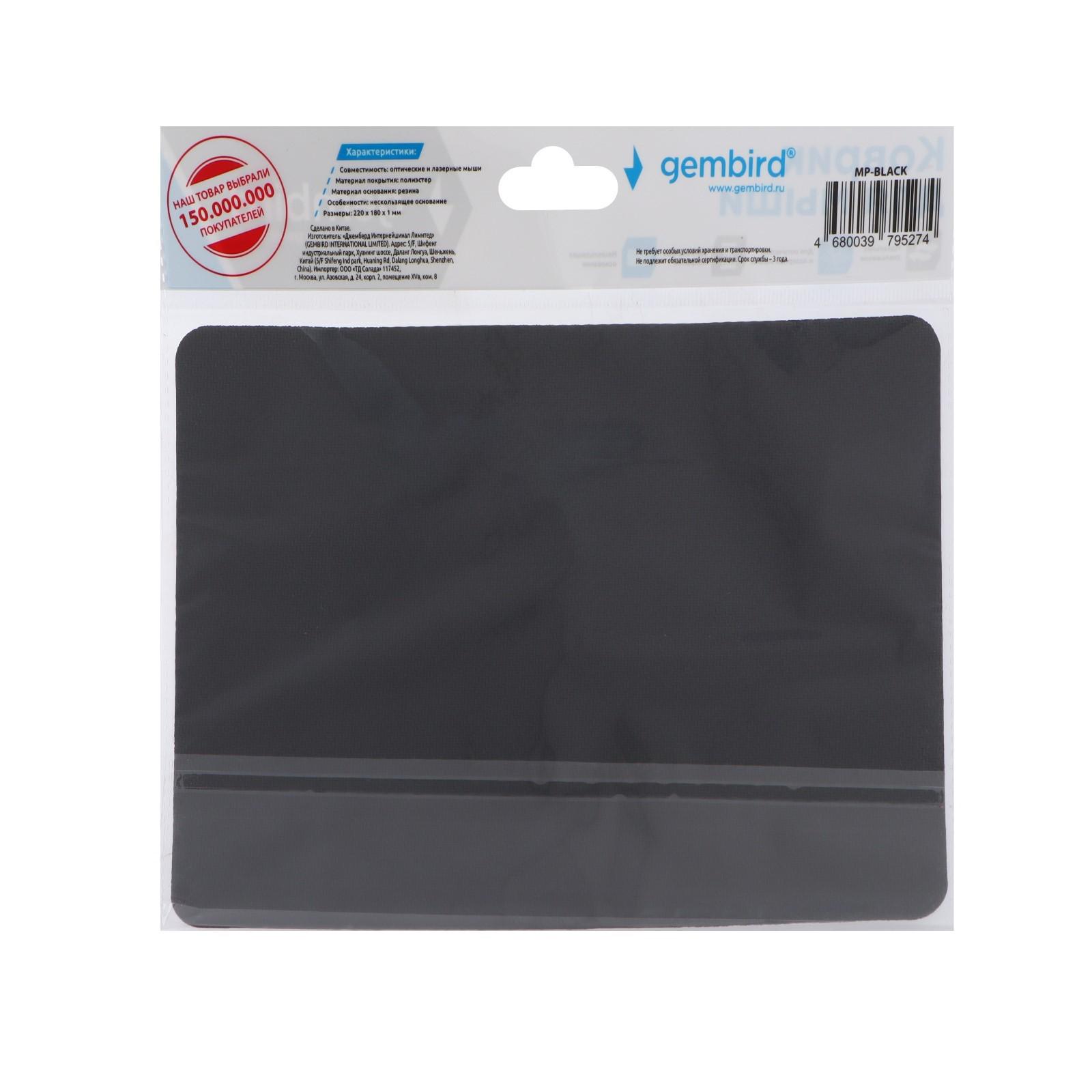 Коврик для мыши Gembird MP-BLACK, 220x180x1 мм, чёрный 9074373