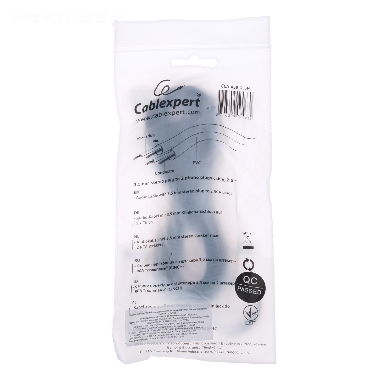 Кабель-переходник аудио Cablexpert CCA-458, Jack 3.5 мм(m)-2xRCA(m), 2.5 м, черный 5282901