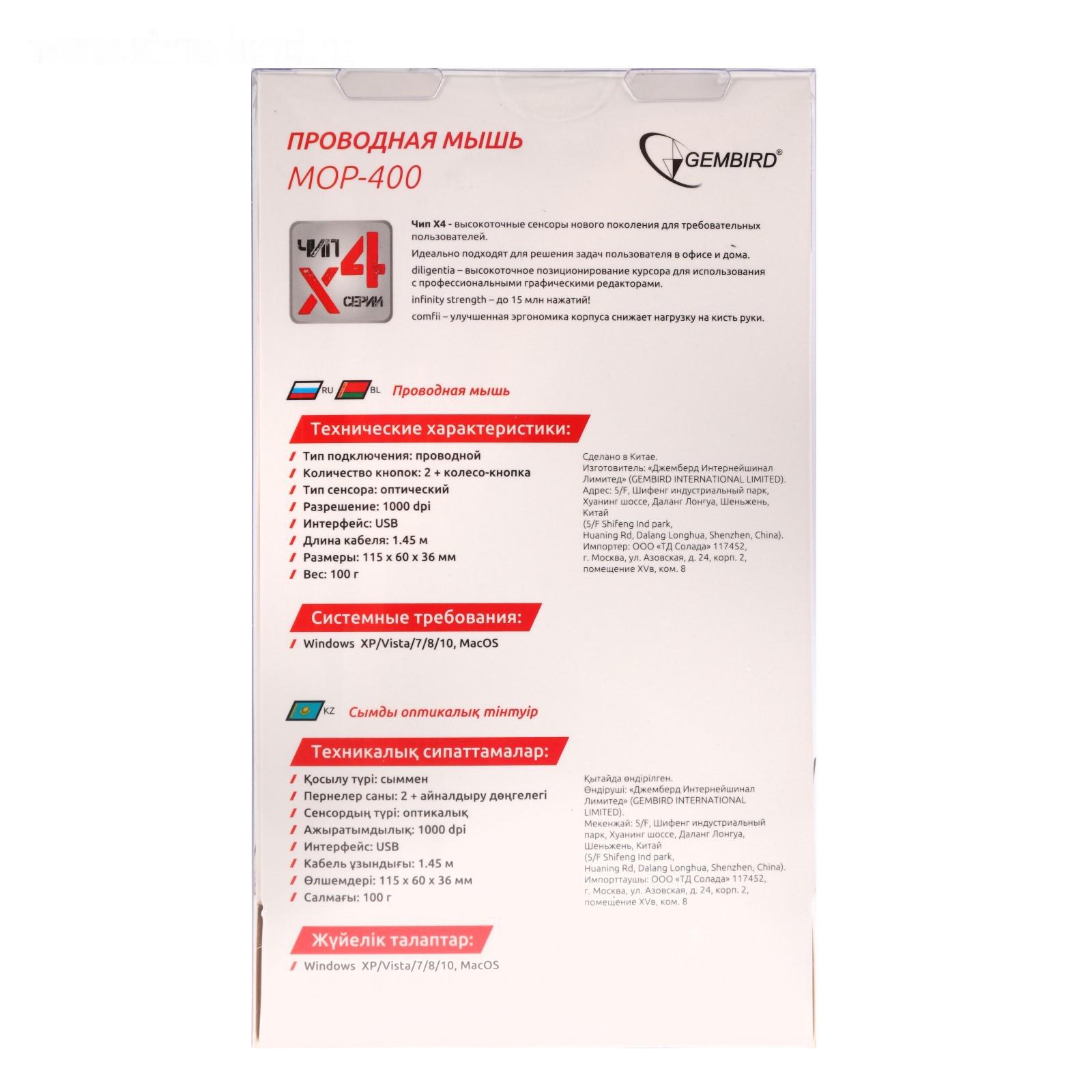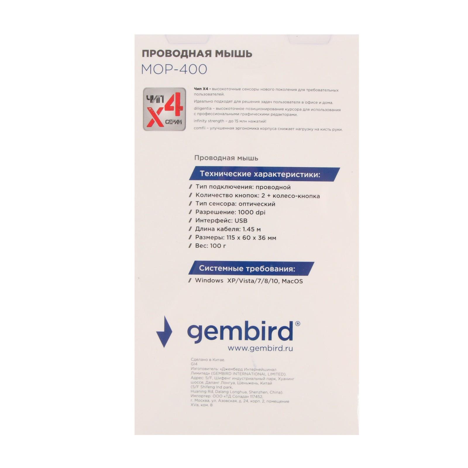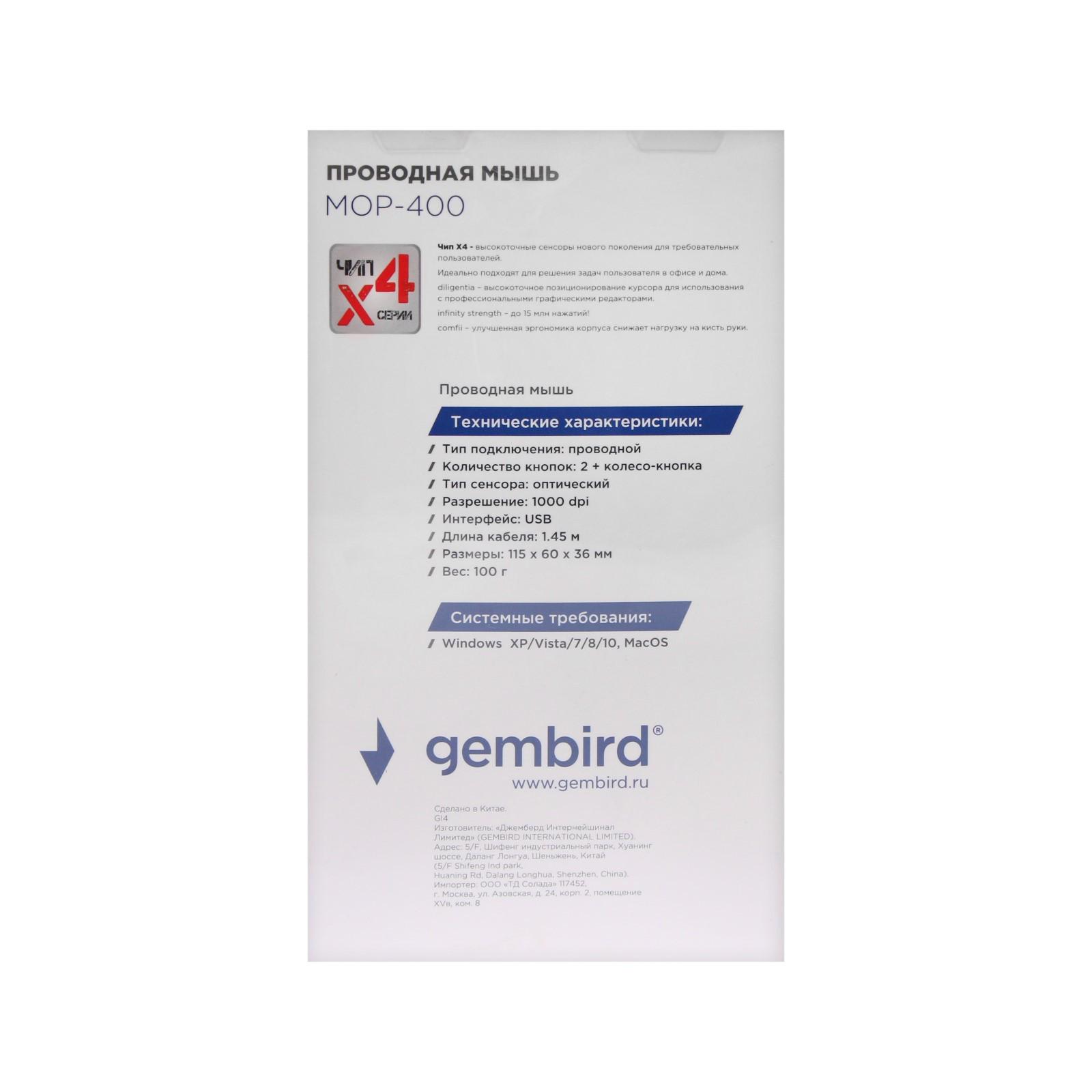 Мышь Gembird MOP-400, проводная, оптическая, бесшумная, 1000 dpi, USB, чёрно-синяя 2611837