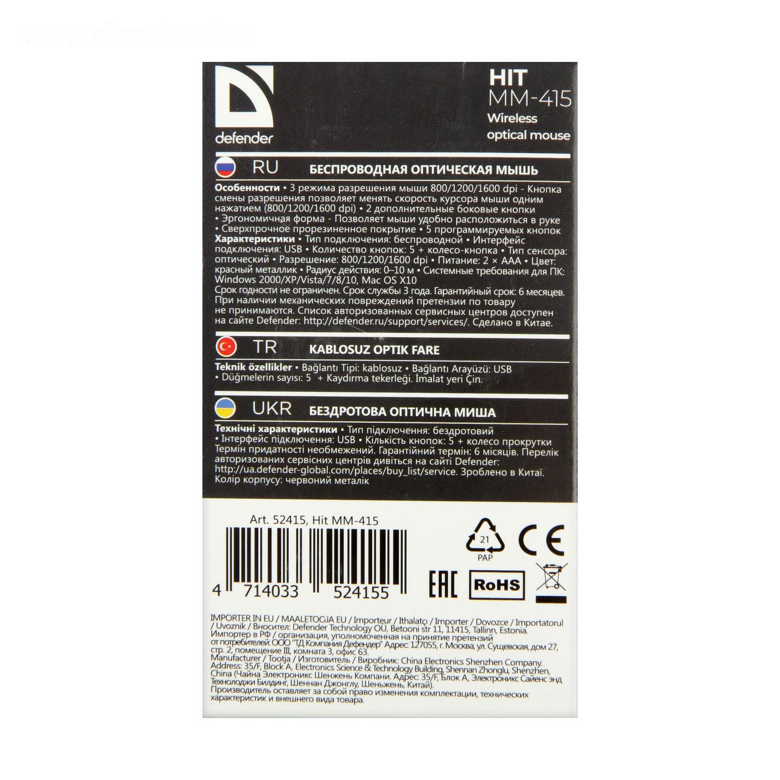 Мышь Defender Hit MM-415, беспроводная, оптическая, 1600dpi, 2хAAA (не в комплекте), красная 4991383