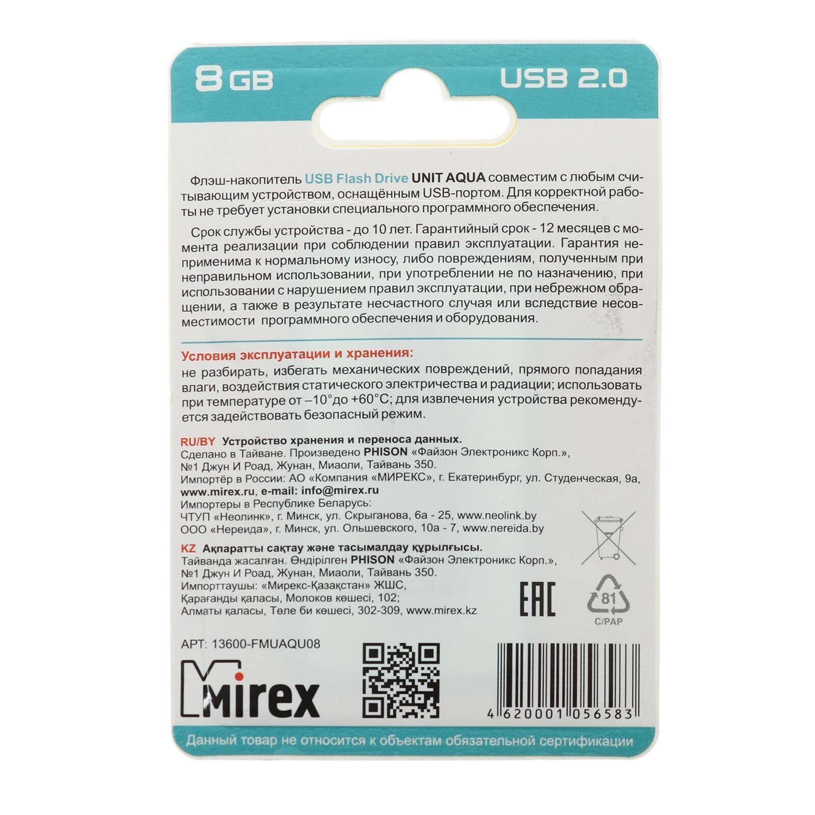Флешка Mirex UNIT AQUA, 8 Гб, USB2.0, чт до 25 Мб/с, зап до 15 Мб/с, синяя 2891013