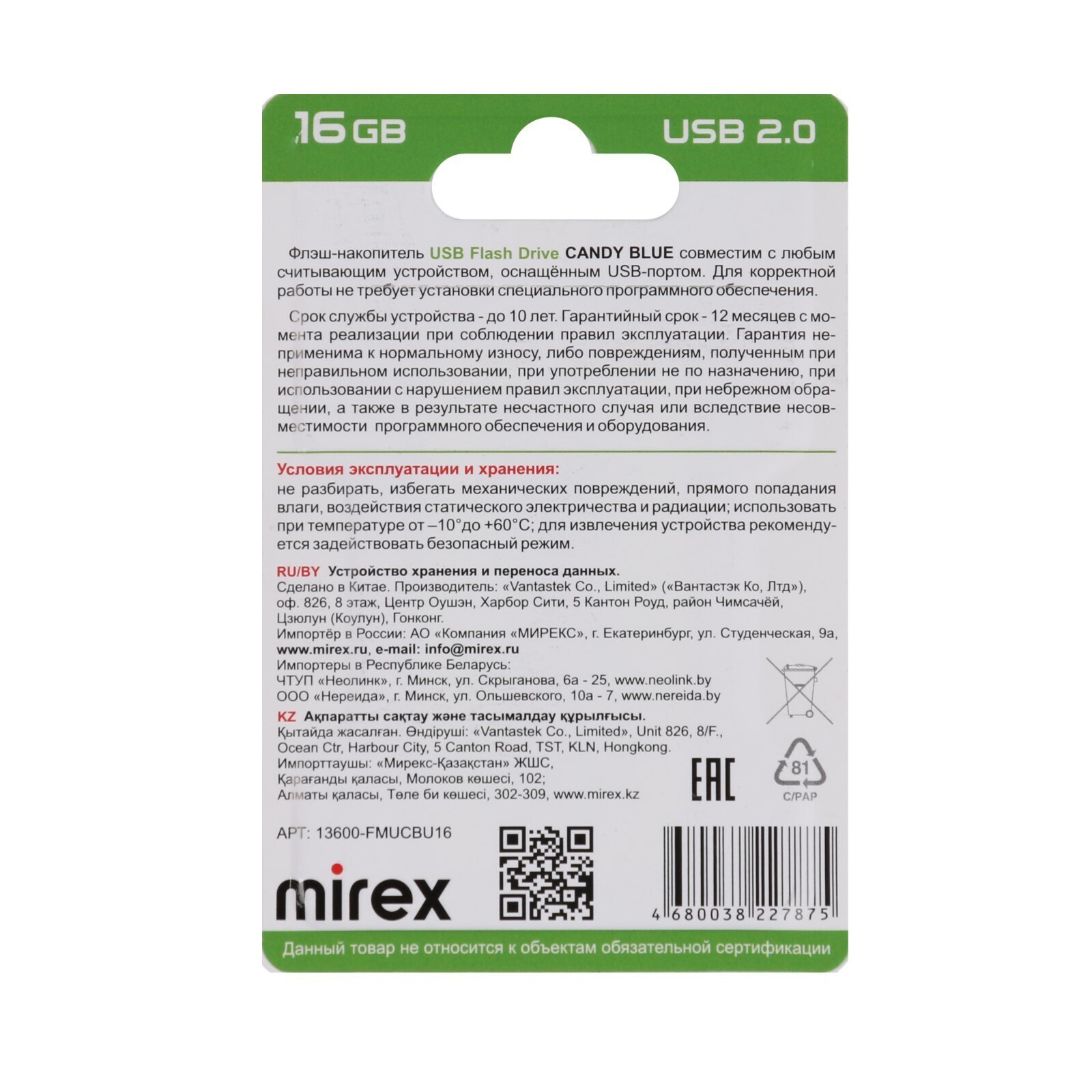 Флешка Mirex CANDY BLUE, 16 Гб ,USB2.0, чт до 25 Мб/с, зап до 15 Мб/с, синяя 9284238