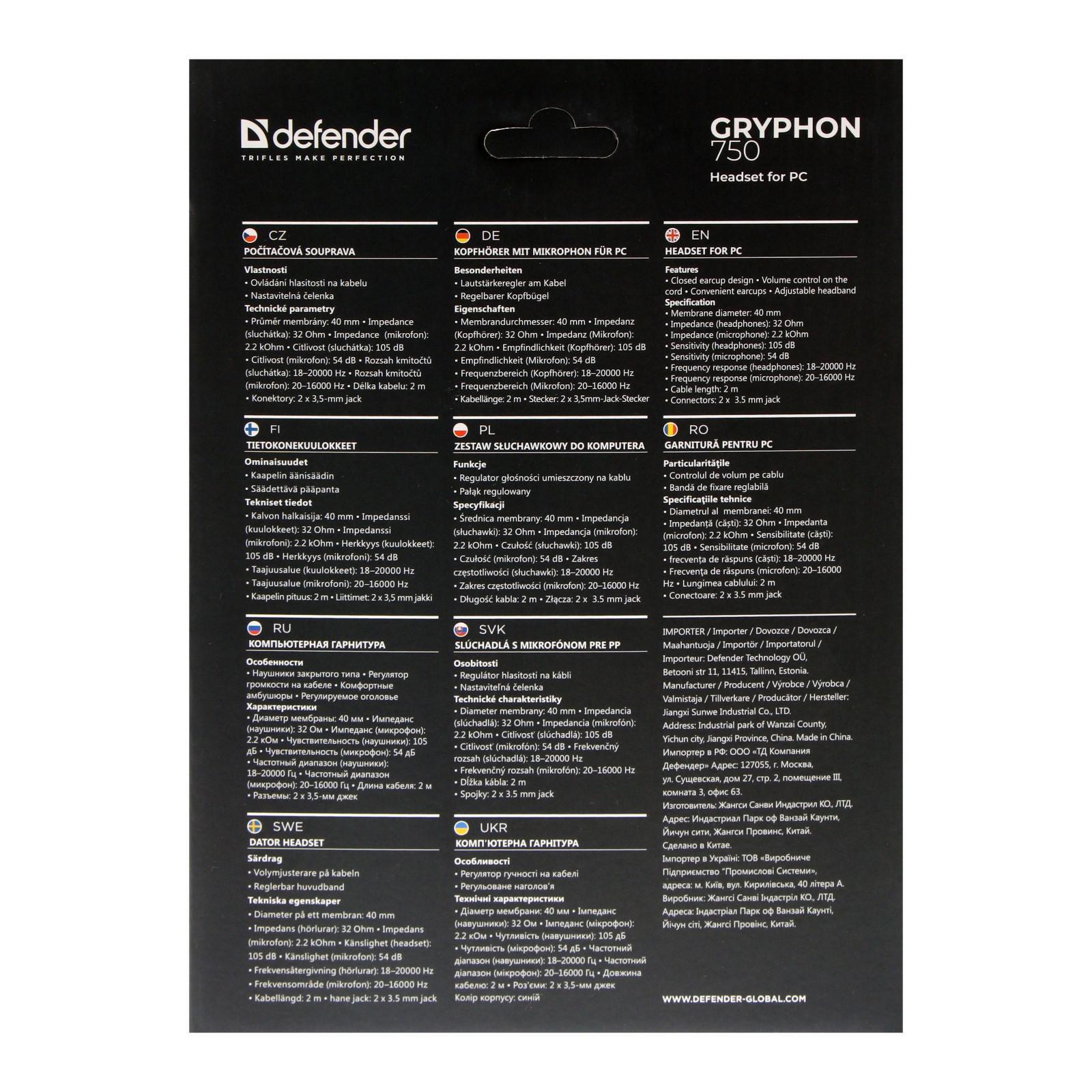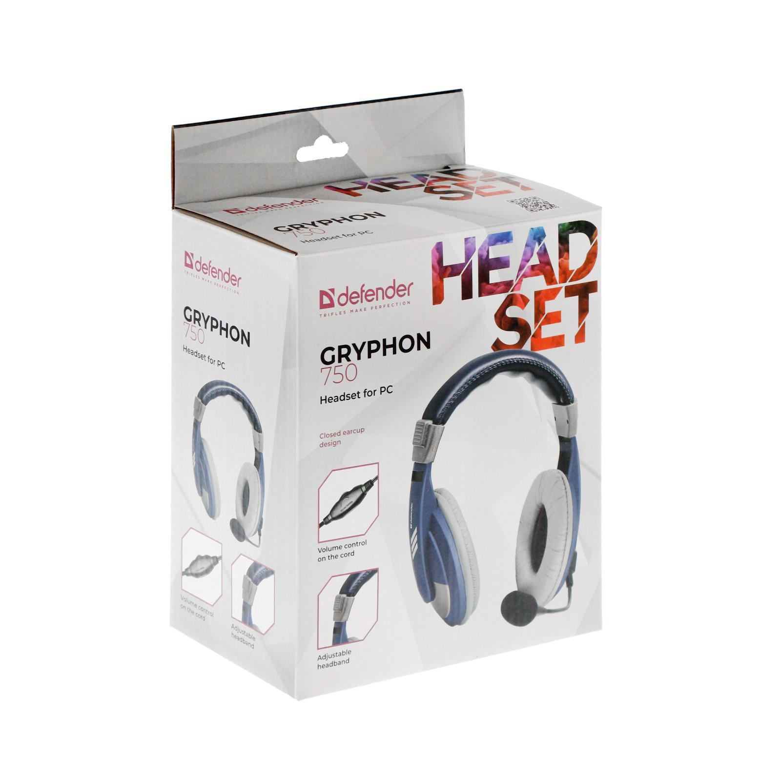 Наушники Defender Gryphon HN-750, компьютерные, микрофон, 105 дБ, 32 Ом, 3.5 мм, 2 м, синие 2483697