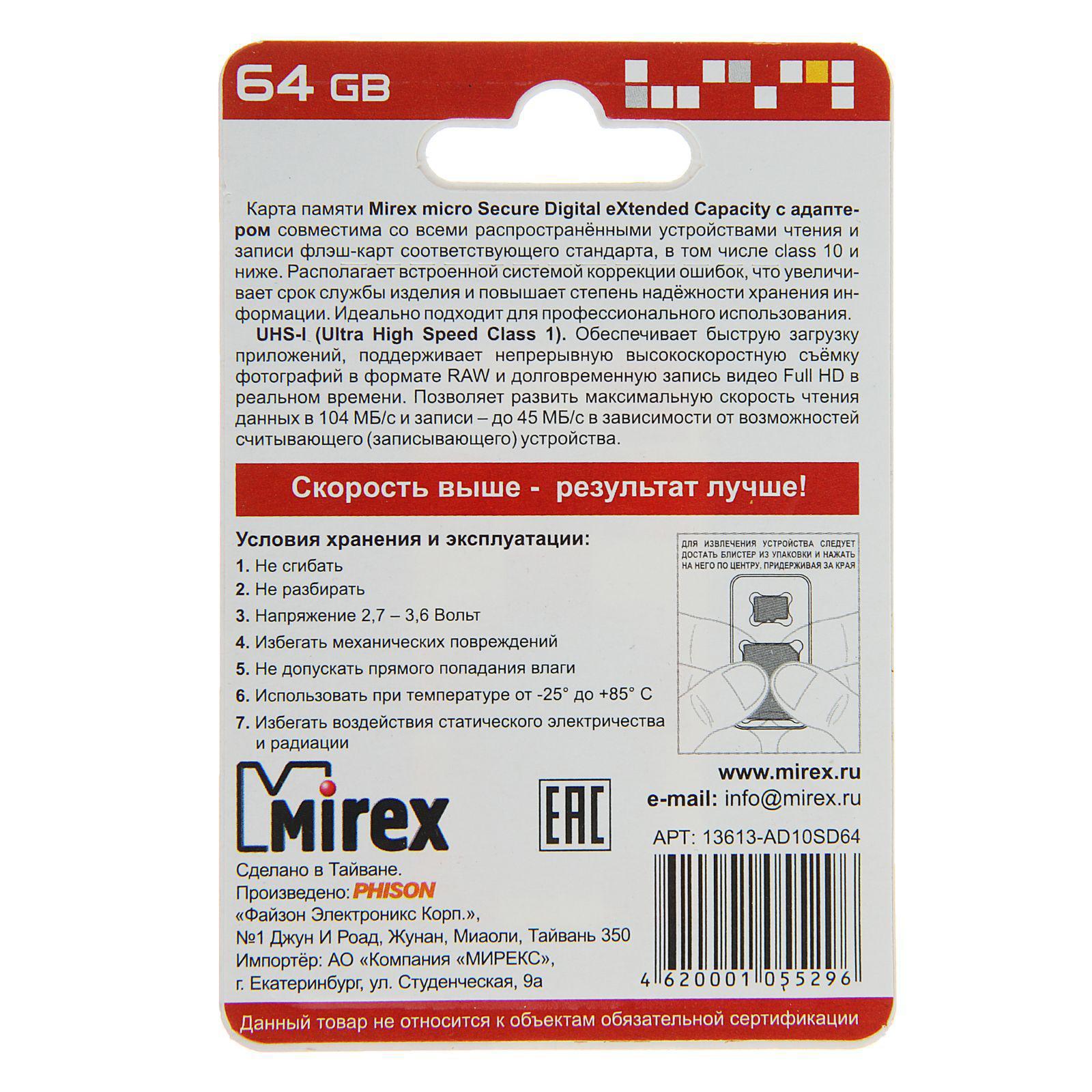 Карта памяти Mirex microSD, 64 Гб, SDXC, UHS-I, класс 10, с адаптером SD 1910888