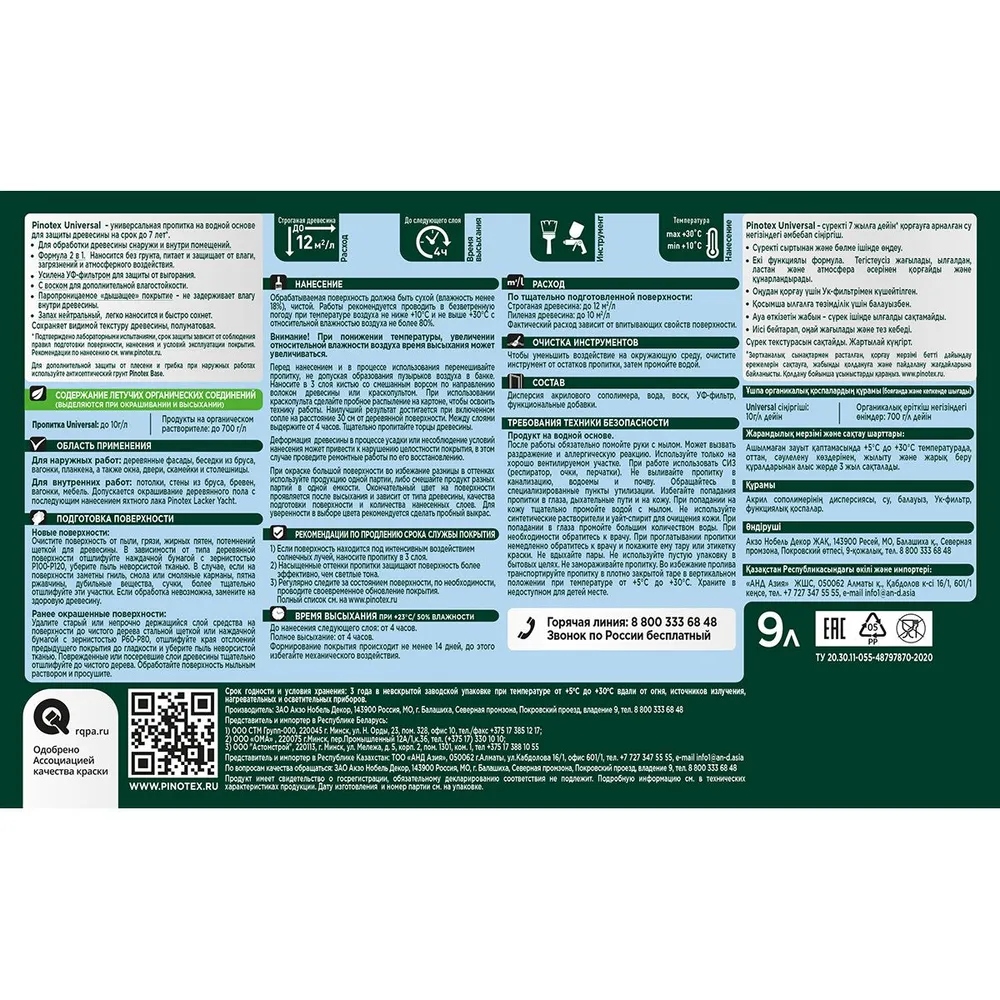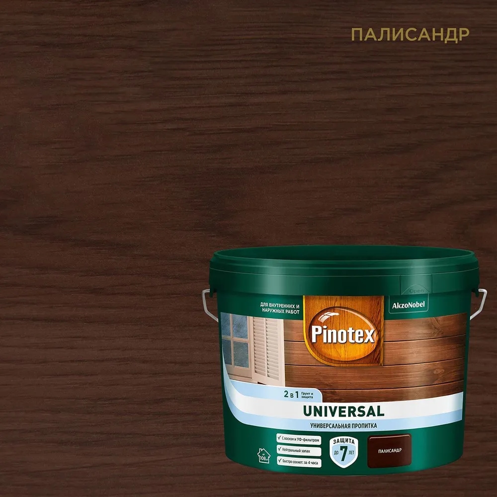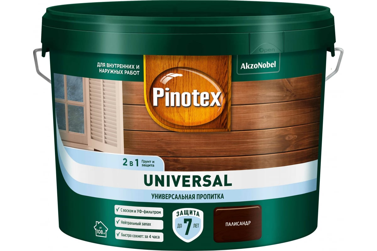 Пропитка для дерева Pinotex Universal используется как для наружных работ, так и безопасна для применения внутри помещений (универсальная), т.к. не содержит биоцидных добавок, не выделяет вредных веществ. Формула 2 в 1: наносится без грунта, питает и защищает от влаги и загрязнений, окрашенная поверхность устойчива к воздействию солнца, дождя, снега и мороза.