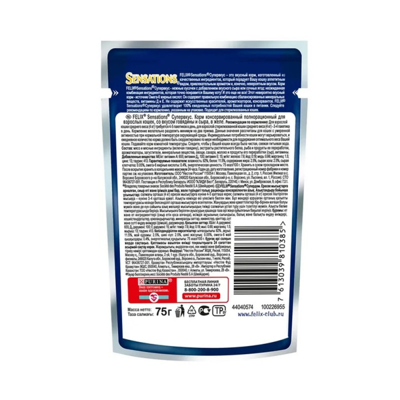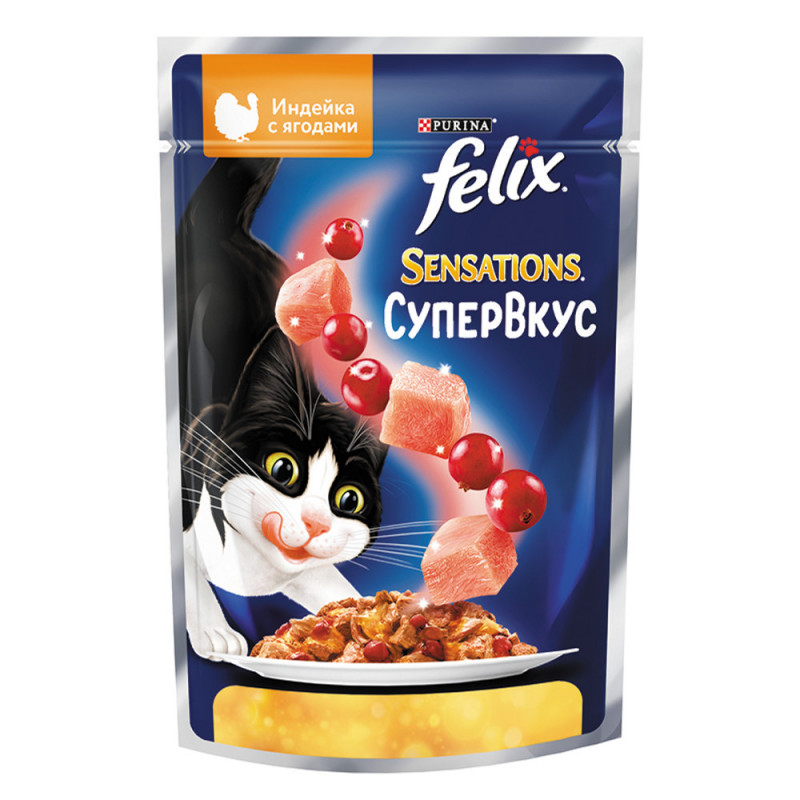 Влажный корм Felix Sensations Супервкус для кошек, со вкусом индейки и ягод, в желе 75 г Упаковка 75г Акция -13%