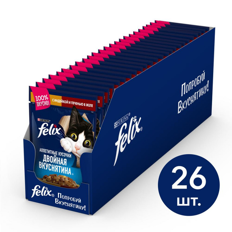 Felix Аппетитные кусочки, Двойная Вкуснятина для взрослых кошек, с индейкой и печенью, в желе 85 г Упаковка 85г Акция -13%