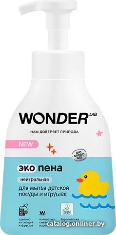 - Пенка WONDER LAB разработана специально для мытья детской посуды, сосок и игрушек. Детское средство в формате пены эффективно работает в горячей и холодной воде. Средство безопасно для малышей, имеет нейтральный PH и полностью смывается водой в считанные секунды, позволяя уменьшить расход воды и быть уверенными в том, что остатки средства не попадут в детский организм. Теперь можно не волноваться, если ребенок решит сам помыть за собой посуду. Пенка быстро смывается с поверхности, посуду не нужно тереть. Средство не сушит и не раздражает кожу. Благодаря мягкому формату пенки, средство расходуется в 2,5 раза экономичнее по сравнению с обычным жидким средством. Пенка WONDER LAB разработана специально для мытья детской посуды, сосок и игрушек. Детское средство в формате пены эффективно работает в горячей и холодной воде. Средство безопасно для малышей, имеет нейтральный PH и полностью смывается водой в считанные секунды, позволяя уменьшить расход воды и быть уверенными в том, что остатки средства не попадут в детский организм. Теперь можно не волноваться, если ребенок решит сам помыть за собой посуду. Пенка быстро смывается с поверхности, посуду не нужно тереть. Средство не сушит и не раздражает кожу. Благодаря мягкому формату пенки, средство расходуется в 2,5 раза экономичнее по сравнению с обычным жидким средством.