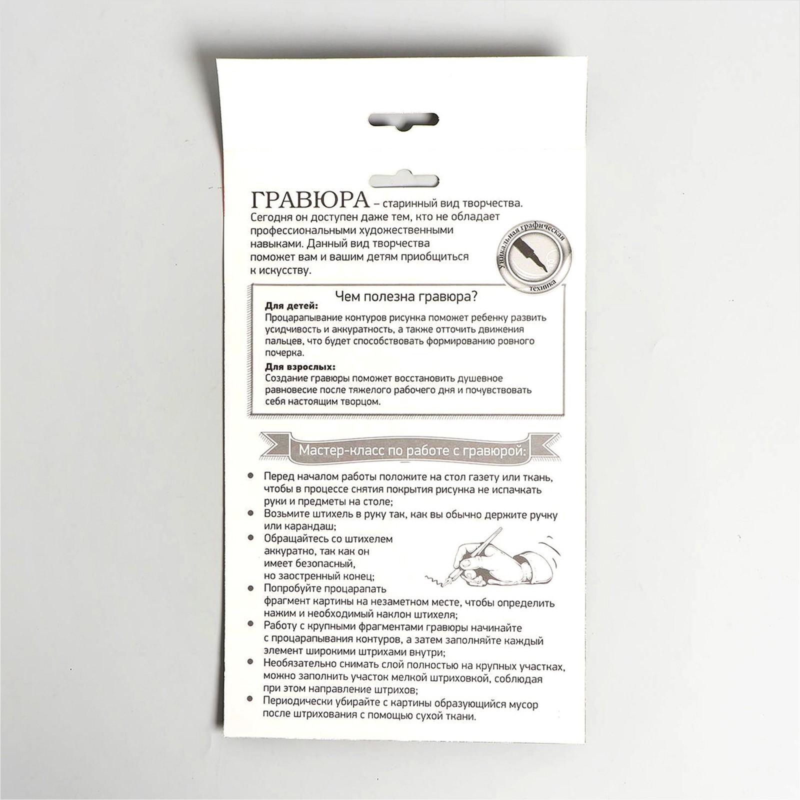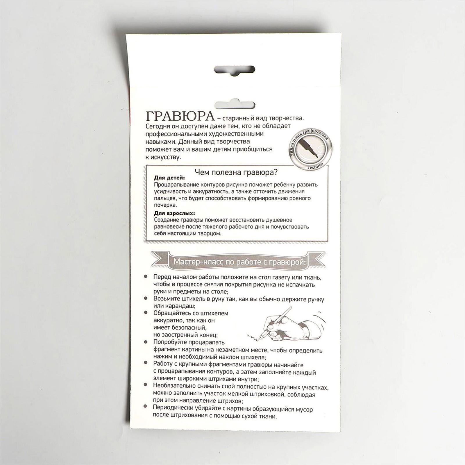 Гравюра представляет собой многослойное панно, покрытое чёрной краской, на которое нанесён контур рисунка. С помощью особого скребка (штихеля), который входит в набор, путём процарапывания и создается гравюра. Новая серия с уникальным дизайном порадует вас разнообразием рисунков.