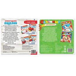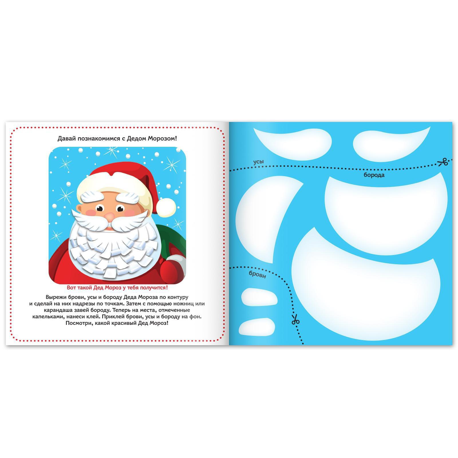 Малыш будет вырезать детали, предложенные в книге, и использовать клей. Ребёнок научится создавать новогодние поделки.