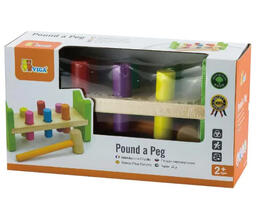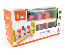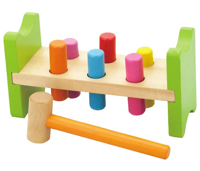 Забивая молоточком разноцветные деревянные колышки, малыш развивает координацию движений и готовится стать помощником папы в домашних делах.