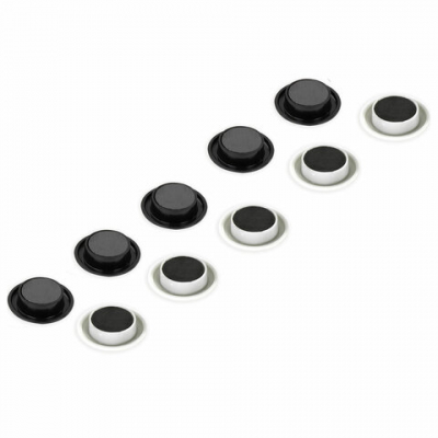 Диаметр магнита составляет 30 мм. 10 штук в комплекте. Надежно удерживаются на любой железной или стальной поверхности. Магниты круглой формы выполнены из пластика белого и черного цветов. Поставляются в удобной блистерной упаковке с европодвесом.
