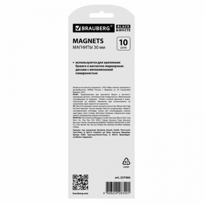 Магниты BRAUBERG "BLACK&WHITE" УСИЛЕННЫЕ 30 мм, НАБОР 10 шт., черные, 237466 SAM_237466