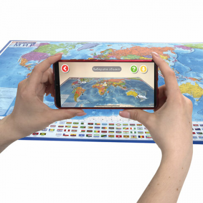 Скачайте приложение IQ Globen на IOS или Android, в главном меню выберите "Карты", откройте карту мира и наведите камеру на один из материков. Эффект дополненной реальности не заставит себя ждать. Герои приложения помогут в изучении мира.