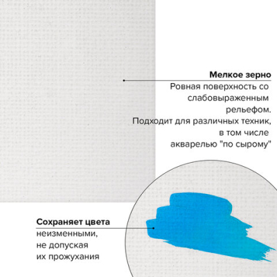 Изготовлен из 100% хлопка плотностью 240 г/м2. Хлопковое полотно характеризуется ровной поверхностью со слабовыраженным рельефом. Специальный тип акрилового грунта позволяет рисовать на холсте акварельными красками. Подходит для техники по-сырому. Односторонний трехслойный акриловый грунт позволяет сохранить цвета неизменными, не допуская их прожухания. Холст прямоугольной формы на подрамнике полностью готов к работе.