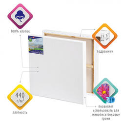 Изготовлен из 100% хлопка плотностью 440 г/м2. Хлопковое полотно характеризуется ровной поверхностью со слабовыраженным рельефом. Основную картину на лицевой стороне холста можно продолжать на широких боковых гранях, тем самым создавая более объёмную картину. Односторонний трехслойный акриловый грунт позволяет сохранить цвета неизменными, не допуская их прожухания. Холст прямоугольной формы на подрамнике полностью готов к работе.