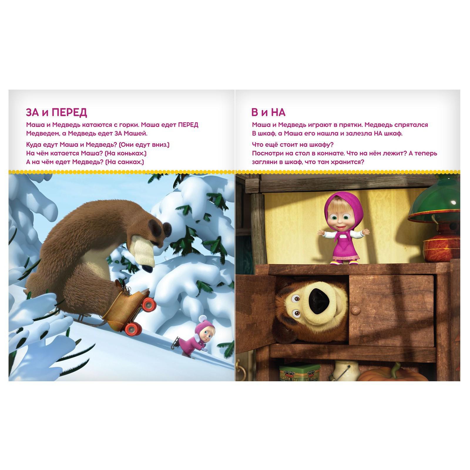Внутри вы найдёте задания на закрепление пространственных понятий: «за» и «перед», «в» и «на» и другие, а также цветные иллюстрации с любимыми героями мультфильма «Маша и Медведь».