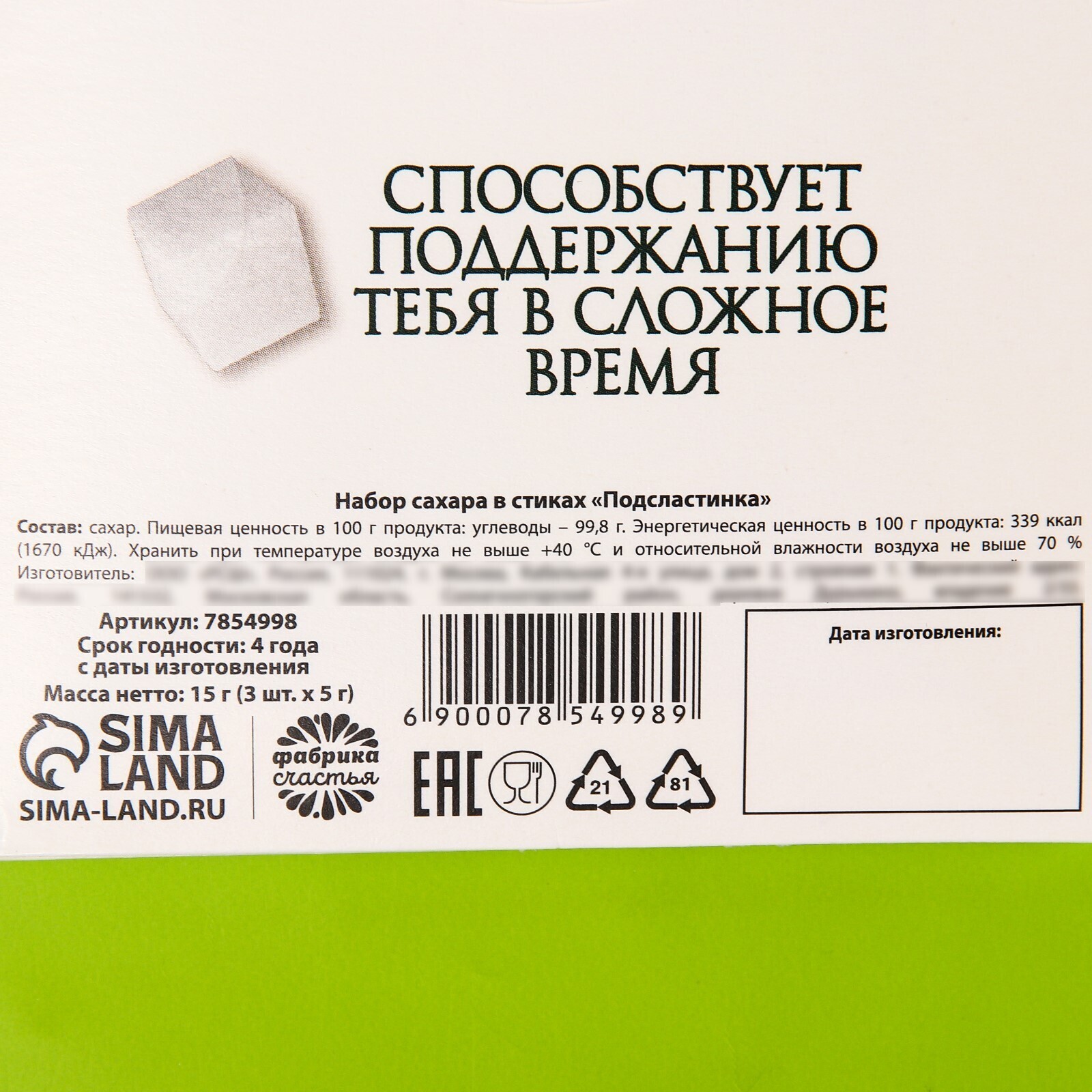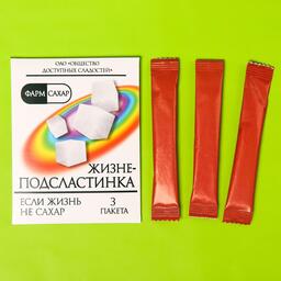 Состав: сахар. Срок годности: 4 года с даты изготовления. Масса нетто: 15 г (3 шт. х 5 г)