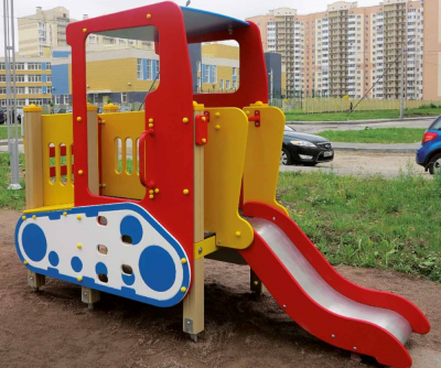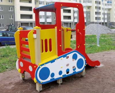 Игровой элемент в виде трактора оснащен входом и окошком. На передней стенке имитация фар и решетки радиатора, сбоку накладные детали с отверстиями (гусеницы). В комплекс можно попасть без лестницы, ухватившись за трубы, d 33 мм, и поднявшись на фанерный пол.
