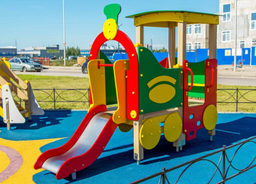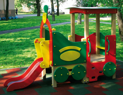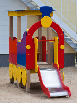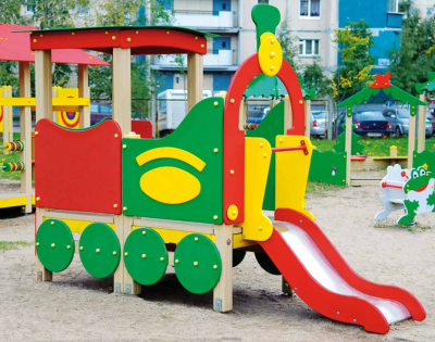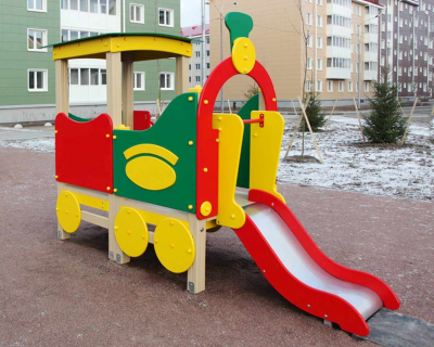 Детская горка в виде паровозика устанавливается на территории начальной школы или детского сада.