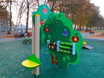 "Дерево знаний" представляет собой конструкцию из несущих стоек и двух плоскостей, соединенных перпендикулярно. Такое соединение образует 4 проема с установленными в них развивающими панелями. Внешние края плоскостей выполнены в форме лиственного дерева из влагостойкой фанеры 21 мм. Несущие столбы конструкции выполнены из клеенного дерева сечением 100х100, снизу оснащены оцинкованными подпятниками D 42 мм для бетонирования в землю, сверху закрыты пластиковыми заглушками.