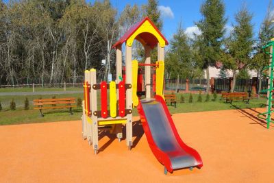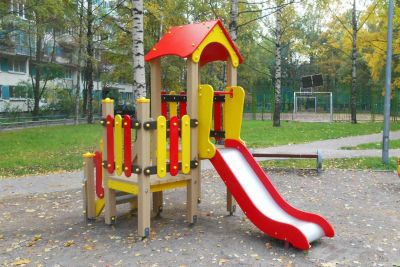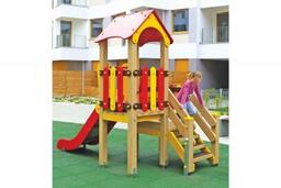Игровой комплекс рассчитан на уличную территорию. Не разбухает под действием осадков, не ржавеет. Для катания выделены: стартовый участок, зона скольжения и финиша.