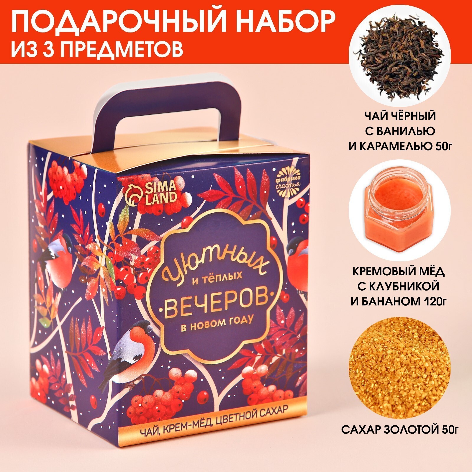 Набор «Уютных и тёплых вечеров», чай чёрный 50 г., крем-мёд с клубникой и бананном 120 г., золотой сахар 50 г. 9047308