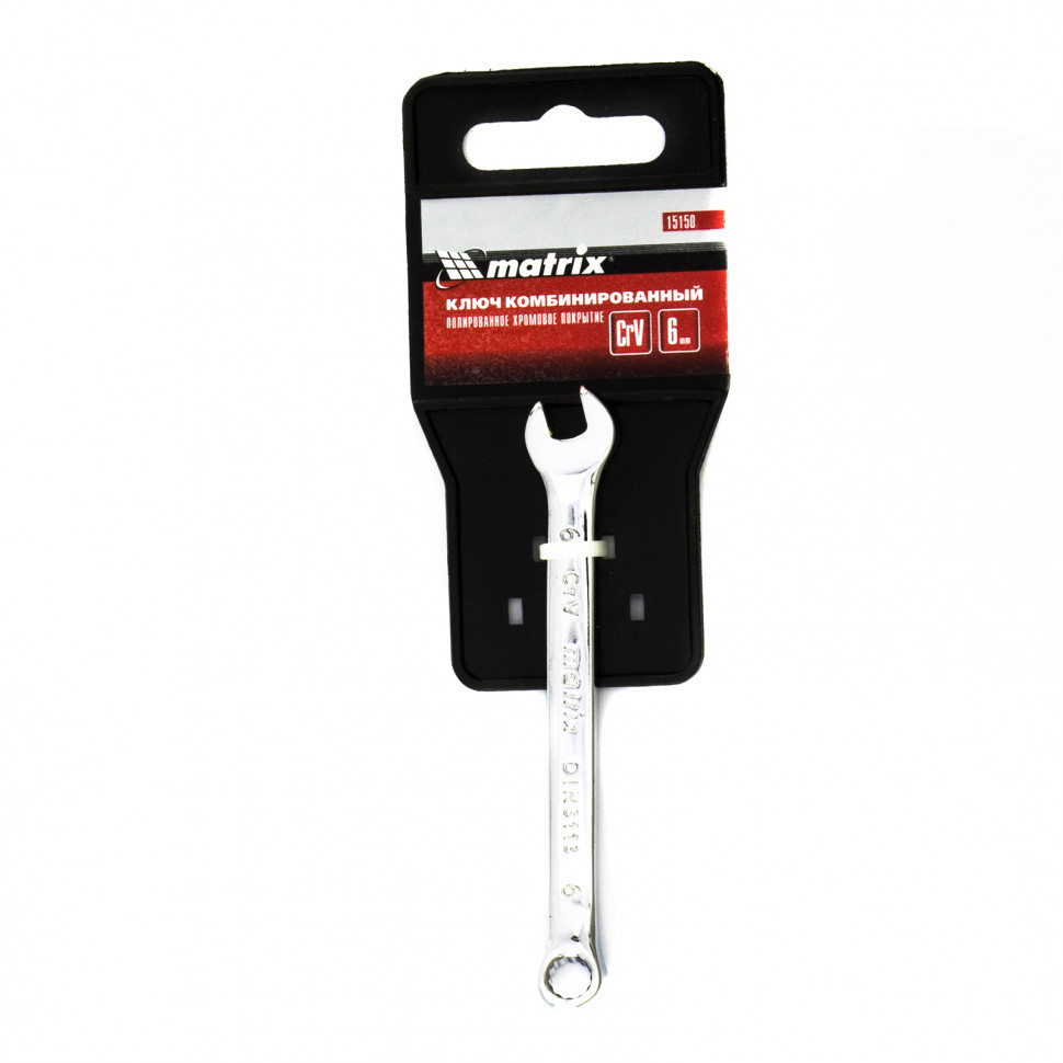 Ключ комбинированный Matrix 15150 из стали CrV, 6 мм, с покрытием «полированный хром»,пригодится при проведении ремонтных работ дома или в гараже. С его помощью можно осуществлять быстрый монтаж и демонтаж крепежных элементов. Кольцевой зев обеспечивает удобство работы благодаря углу наклона 15 градусов относительно плоскости инструмента.ПреимуществаКлюч из хромованадиевой стали обладает необходимыми прочностными характеристиками и высокой сопротивляемостью деформации.Рабочая часть ключа прошла закалку до твердости 45 HRC в соответствии с требованиями ГОСТа.Полированное хромовое покрытие защищает ключ от образования коррозии.Накидные части с 12-гранным профилем позволяют охватить крепеж по всей поверхности, за счет чего снижается риск деформации его граней.Ключ удобно хранить и он не потеряется во время транспортировки, т.к. упакован в пластиковый держатель.