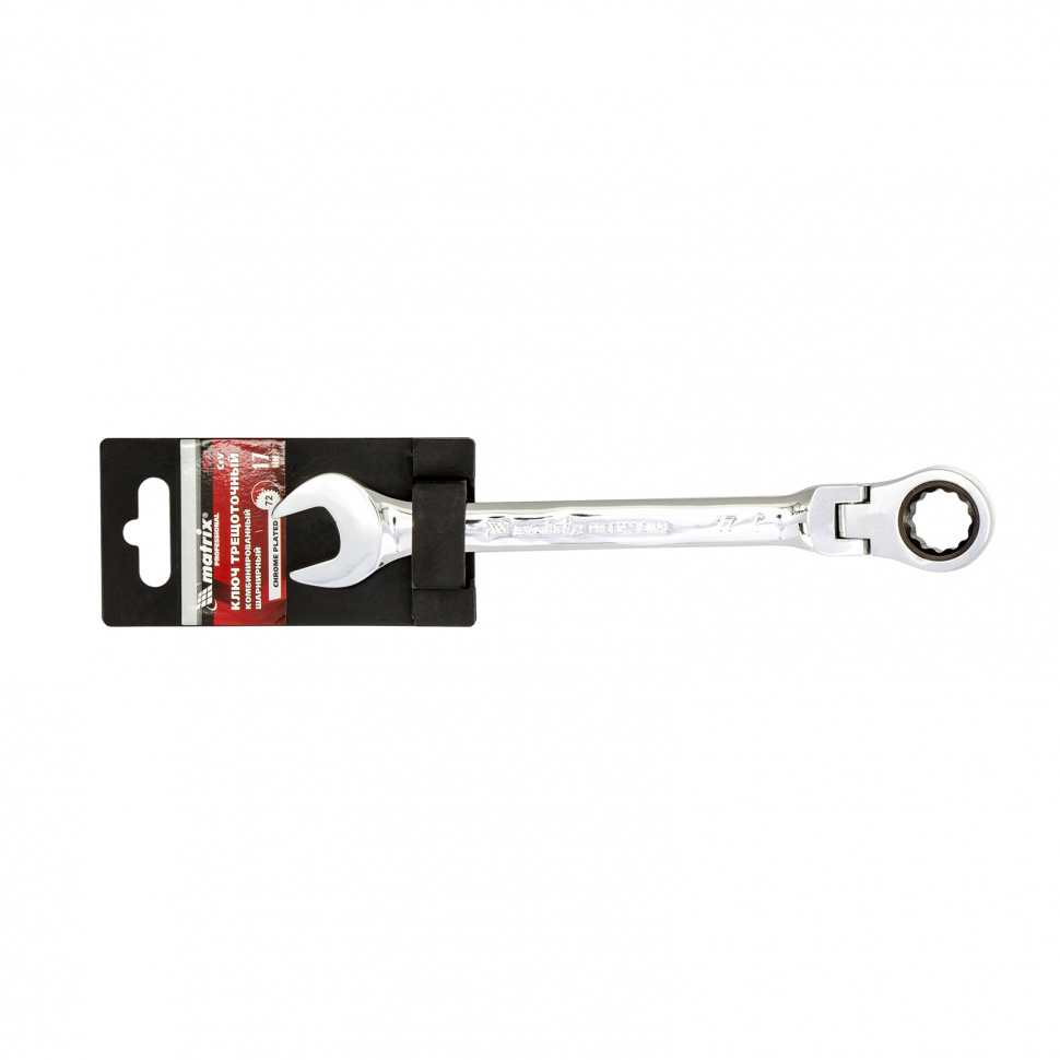 Ключ комбинированный, трещоточный шарнирный Matrix 14869, 17 мм, с покрытием «зеркальный хром», пригодится автолюбителями и мастерам для фиксации и раскручивания крепежных элементов. Трещоточный механизм повышает скорость монтажа и легко справляется даже с закисшим крепежом. А шарнир эффективен для работы в труднодоступных местах, т.к. позволяет вращать рабочую головку под разным углом (0-180 градусов).ПреимуществаКлюч устойчив к механическим нагрузкам за счет прочной конструкции из высококачественной стали 40CrV.Хромоникелевое покрытие предотвращает образование коррозии на ключе.Накидная часть с 12-гранным профилем захватывает поверхность деталей полностью, поэтому повреждение их граней исключено.Храповый механизм на 72 зуба обеспечивает легкий и плавный ход ключа.Высокая твердость материала храпового механизма 58 HRC обеспечивает его надежность и долговечность.Ключ удобно хранить и транспортировать благодаря пластиковому держателю в комплекте.